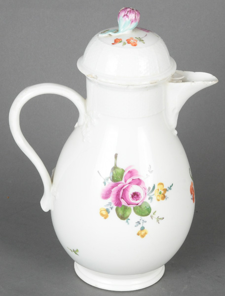 - Katalog-Nr: 2341Kaffeekanne. Meissen 18. Jh. Porzellan, bunt bemalt mit Blumendekor; am Boden unterglasurblaue Schwertermarke, H=23,5 cm. (best.)o.L.