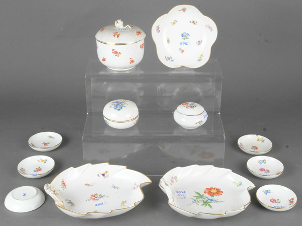 - Katalog-Nr: 2332Zwölftgs. Konvolut Porzellan, u.a. „Streublumen“. Meissen 19./20. Jh. Porzellan, bemalt bemalt; am Boden unterglasurblaue Schwertermarke, teilw. mit einem bzw. zwei Schleifstrichen. Bestehend aus: Eine Kaffeekanne (H=21 cm), ein Milchgießer (H=9 cm), zwei Zuckerdosen (H=8 / 10 cm), zwei Tassen mit Unterschalen, ein Gedeck (Teller: D=18 cm), zwei Deckeldosen (H=5 cm, D=7 / 7,5 cm), eine Deckeldose (H=4,5 cm, B=12 cm, T=8,5 cm), ein Tafelaufsatz (H=14,5 cm, D=20 cm) und ein Cachepot (H=11,5 cm).o.L.