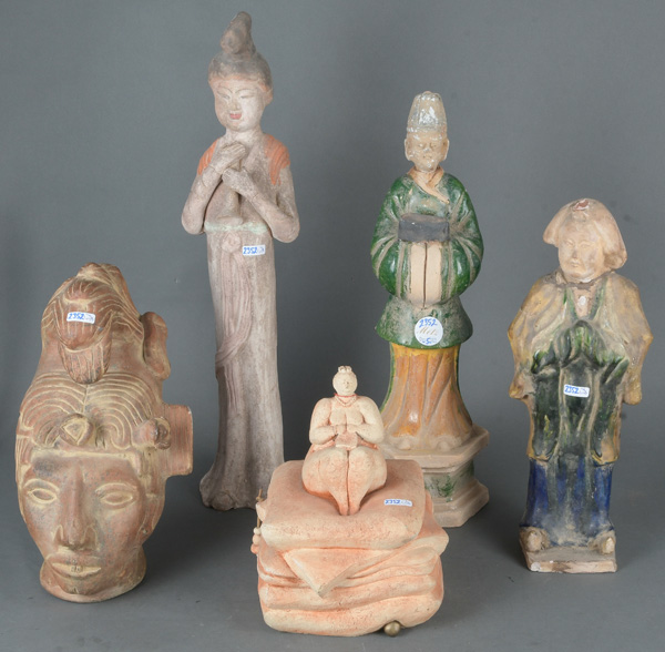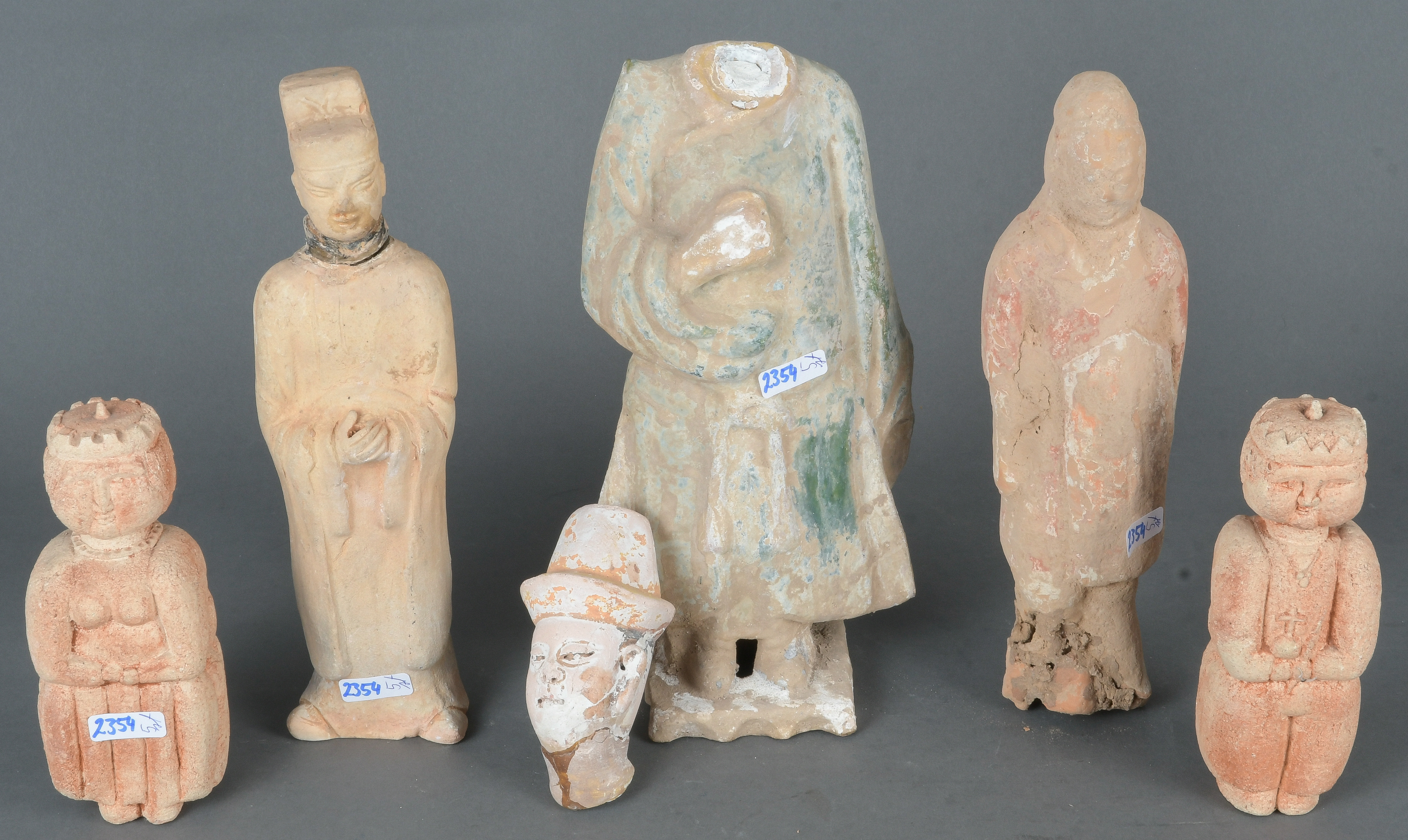 - Katalog-Nr: 2352Ein Kopf und vier Figuren. Asien. Ton, teilw. glasiert, H=23 bis 53 cm. (besch. / rest.)o.L.