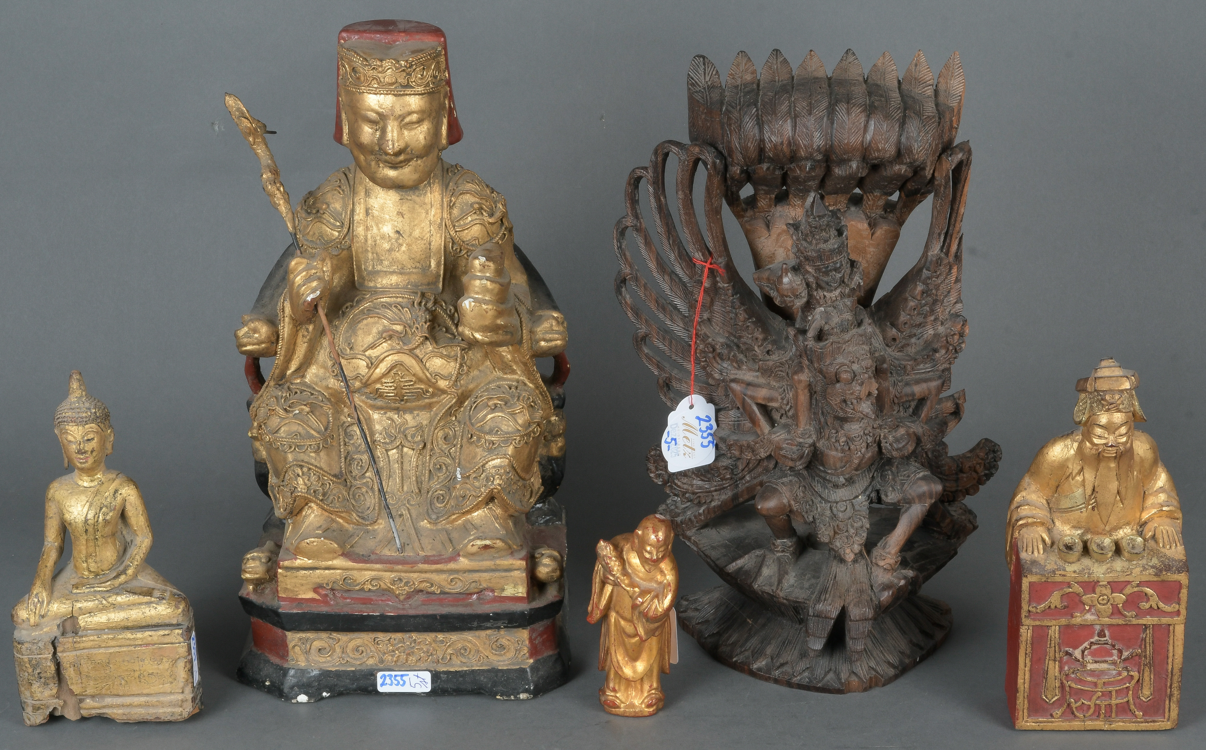 - Katalog-Nr: 2355Fünf Buddha-, Gottheits- und Weisheitsfiguren. Asien. Massivholz, geschnitzt, teilw. bemalt und vergoldet, H=11 bis 31 cm.o.L.