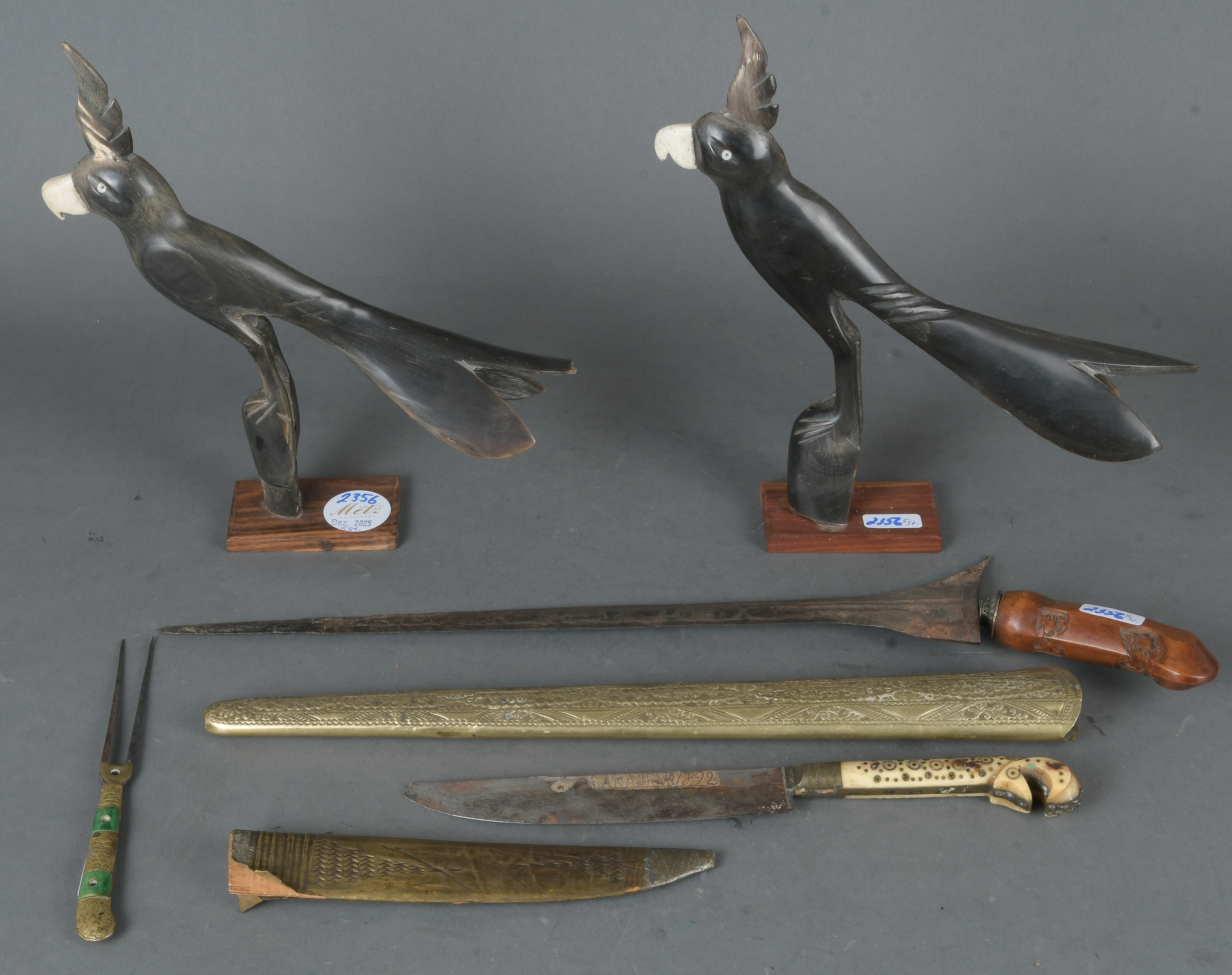 - Katalog-Nr: 2356Fünftlgs. Konvolut Asiatika: Zwei Papageien aus poliertem Horn (H=24 cm), ein Kris (L=45,5 cm), ein Bosniak (L=27 cm) und eine Gabel (L=17 cm).o.L.
