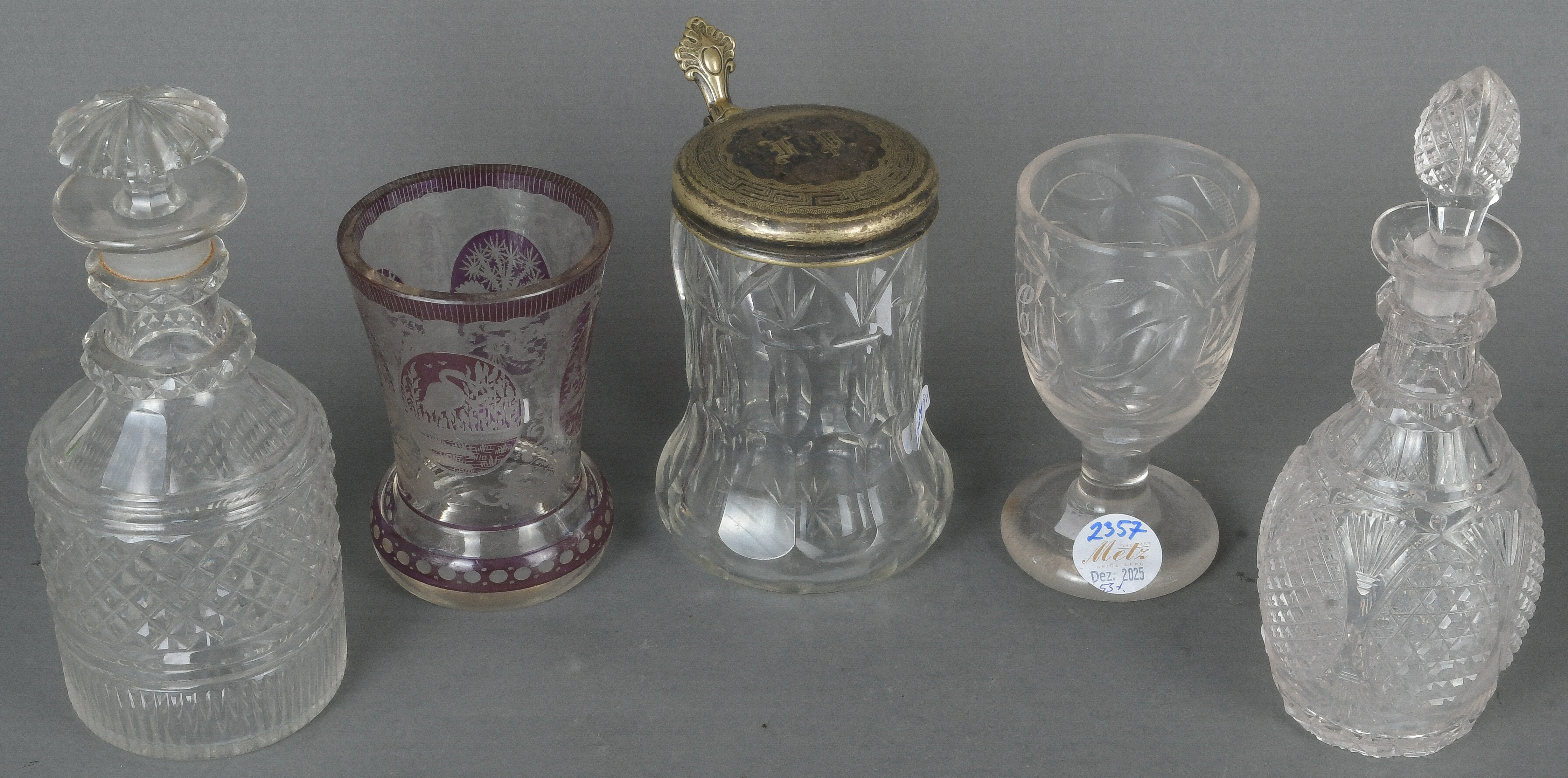 - Katalog-Nr: 2357Fünftlgs. Konvolut Glas. Deutsch 1880 und später. Teilw. geschliffen und geätzt. Bestehend aus: Ein Bierseidel mit Silberdeckel (H=16 cm), zwei Becher (H=13 / 14 cm) und zwei Karaffen (H=21 / 24 cm).o.L.