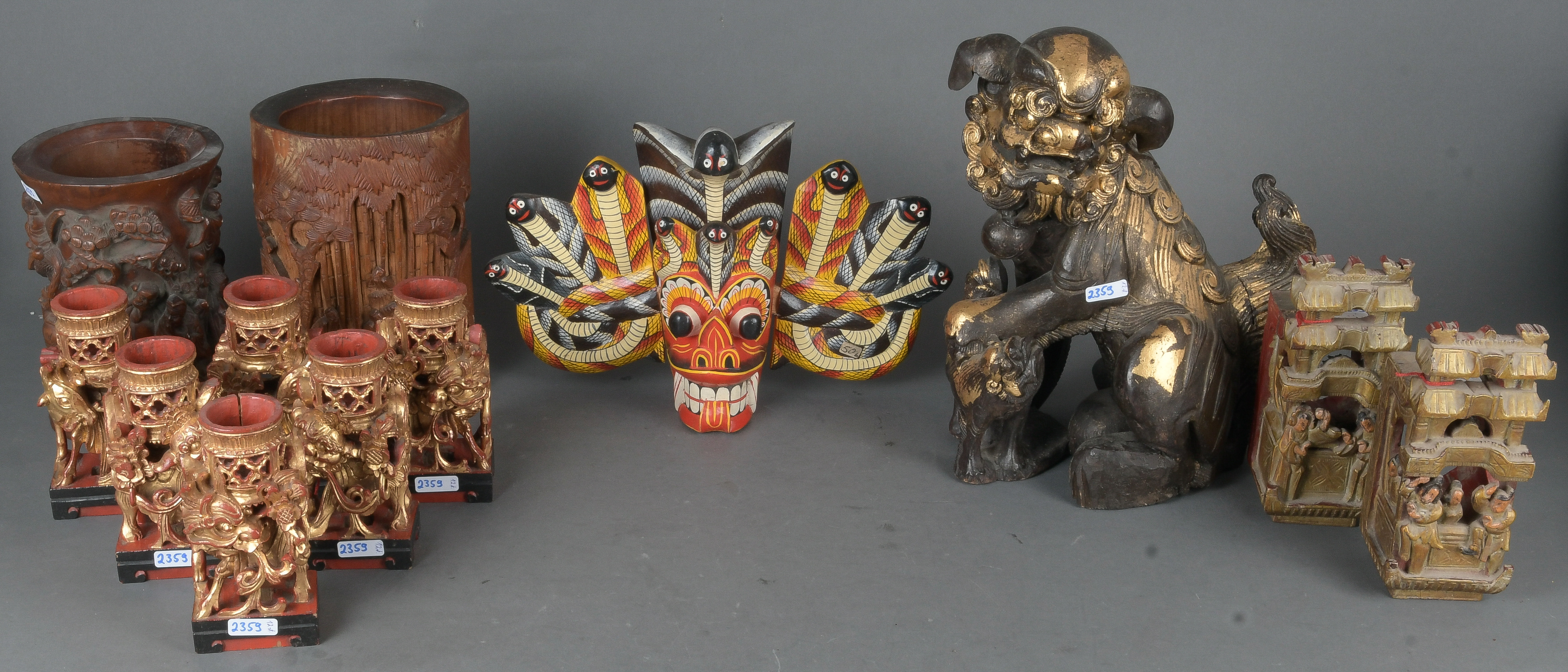- Katalog-Nr: 2359Zwölftlgs. Konvolut Asiatika: Ein Fo-Hund, sechs Kerzenleuchter, eine Maske, zwei Pinselbecher, zwei Zierteile in Tempelform mit Personen. Teilw. Massivholz, geschnitzt, teilw. bemalt und vergoldet, H=13 bis 28 cm.o.L.