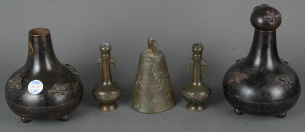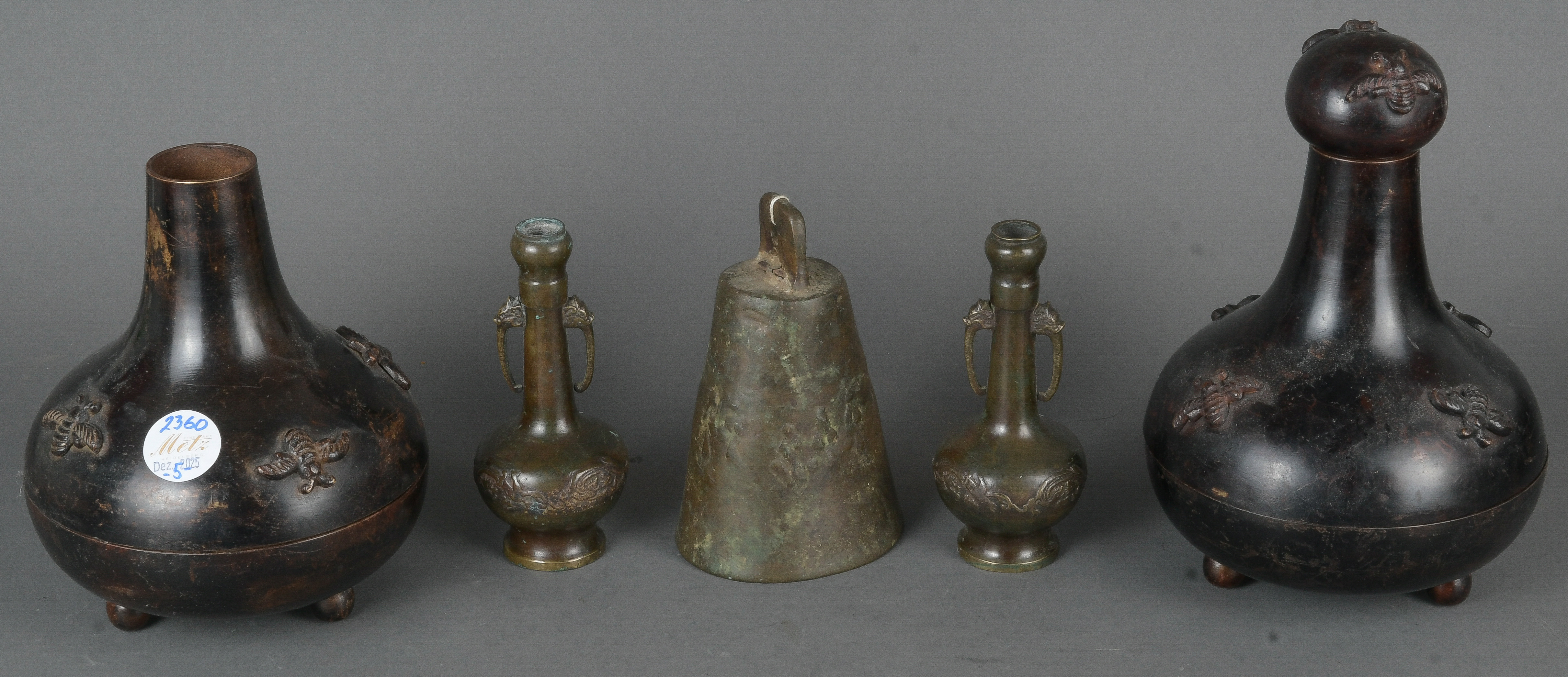 - Katalog-Nr: 2360Fünftlgs. Konvolut Asiatika: Eine Glocke, zwei Kerzenleuchter und zwei Wespenfallen. Bronze / Metall, H=15 bis 19 cm. (ein Wespenfallendeckel fehlt)o.L.