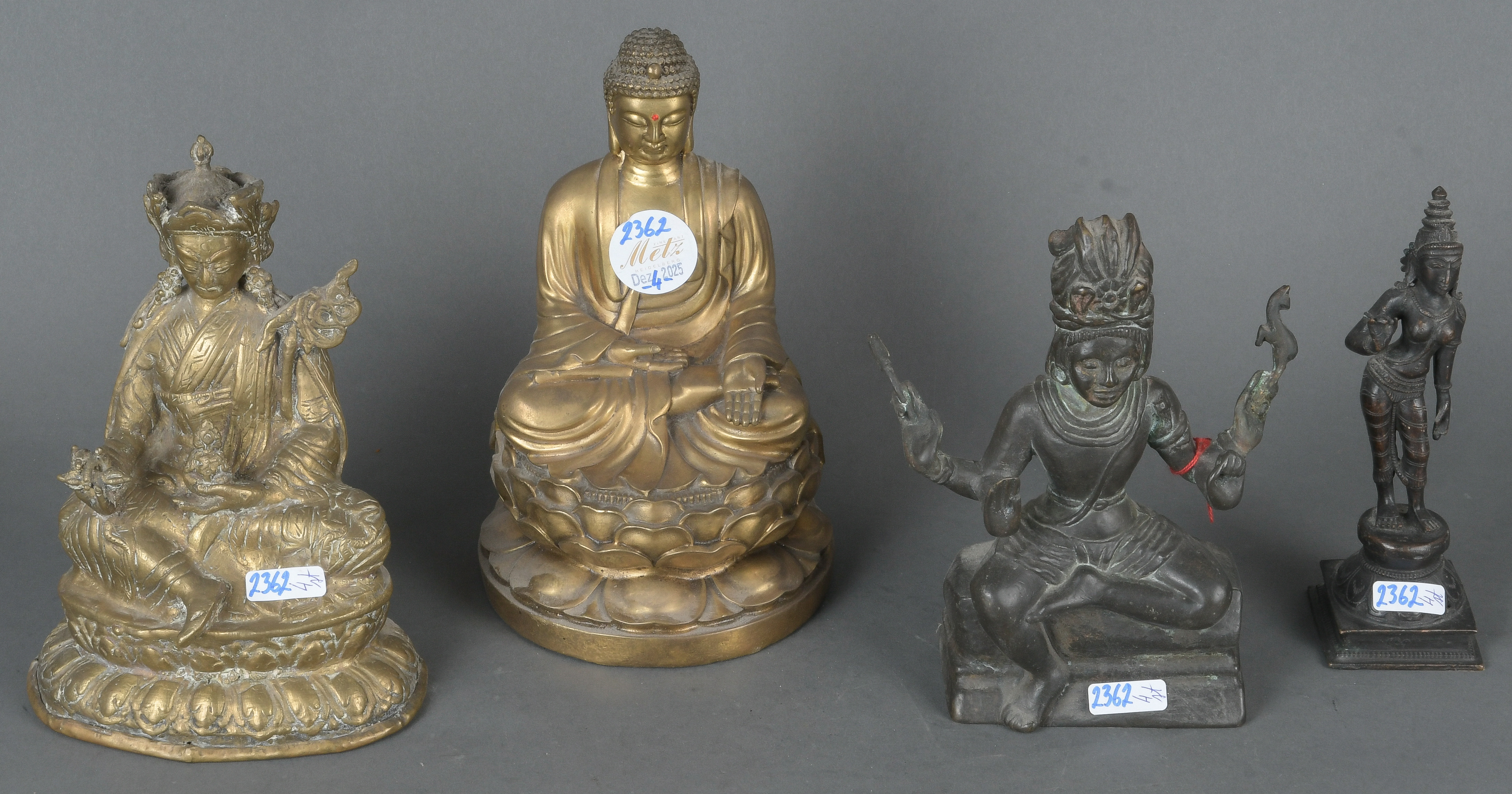 - Katalog-Nr: 2362Zwei Buddhas und zwei weitere Figuren. Asien. Messing / Metall, H=16 bis 20 cm.o.L.