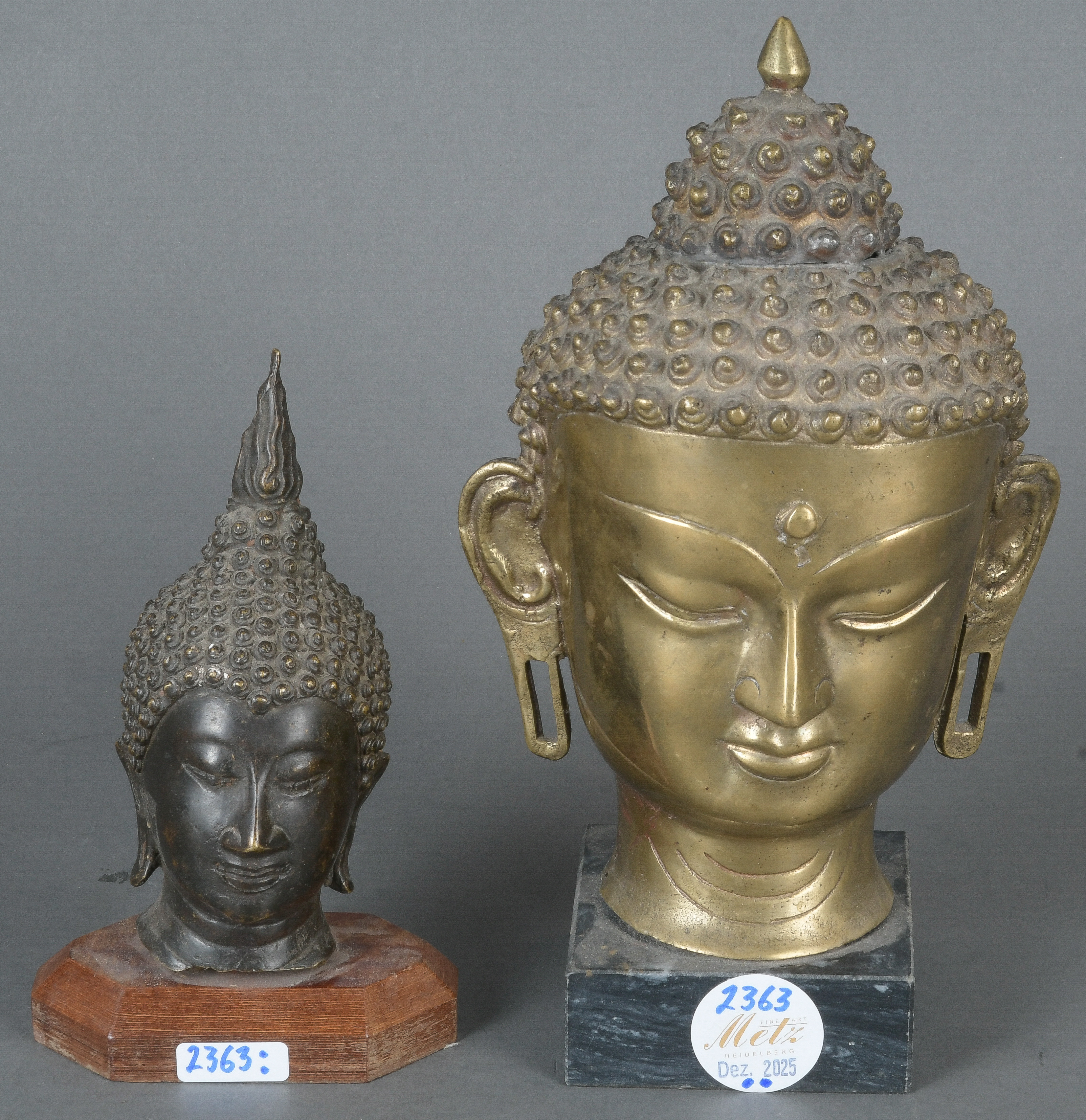 - Katalog-Nr: 2363Zwei Buddhaköpfe auf Sockel. Asien, Bronze, H=16 / 24 cm.o.L.