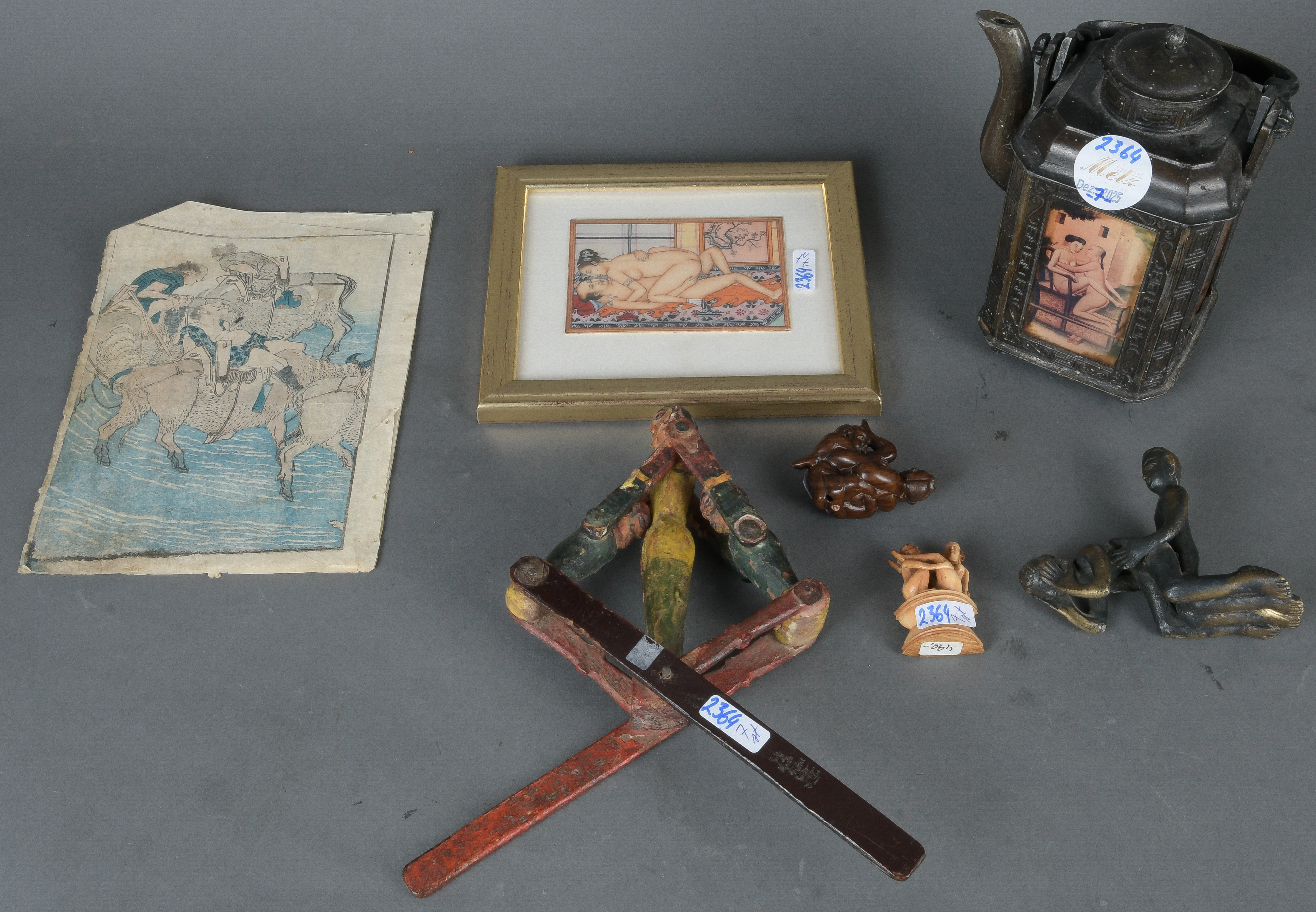 - Katalog-Nr: 2364Konvolut Erotika. Asien. Meist Figuren aus Horn / Holz, geschnitzt, sowie Metall und Holzschnitt, H=4,5 bis 25 cm.o.L.