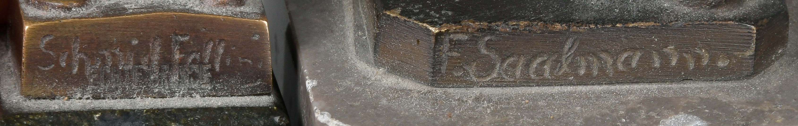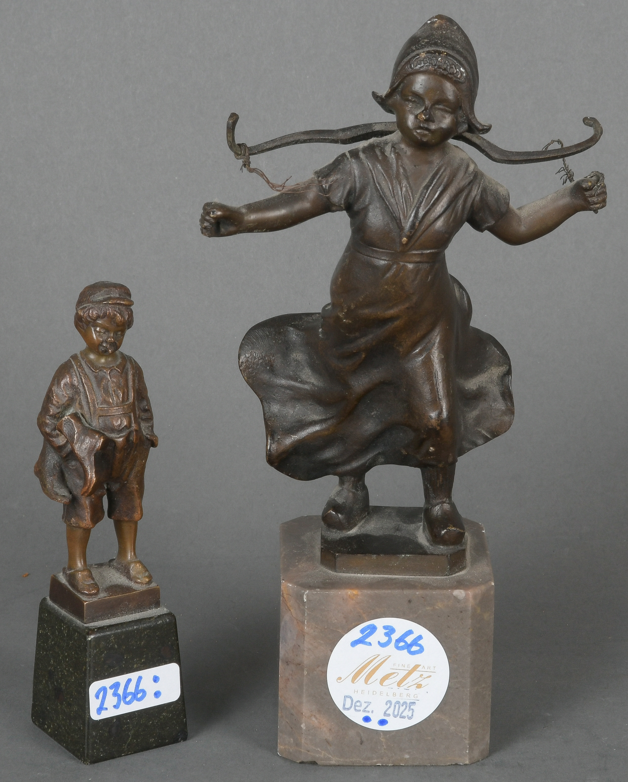 - Katalog-Nr: 2366Julius Paul Schmidt-Felling (1835-1920). Stehender Junge. Bronze, am Sockel sign. (H=12 cm); dazu Erich Saalmann (act. 1918-1932). Wasserträgerin. Bronze, auf Marmorsockel, am Sockel sign., H=19 cm.o.L.