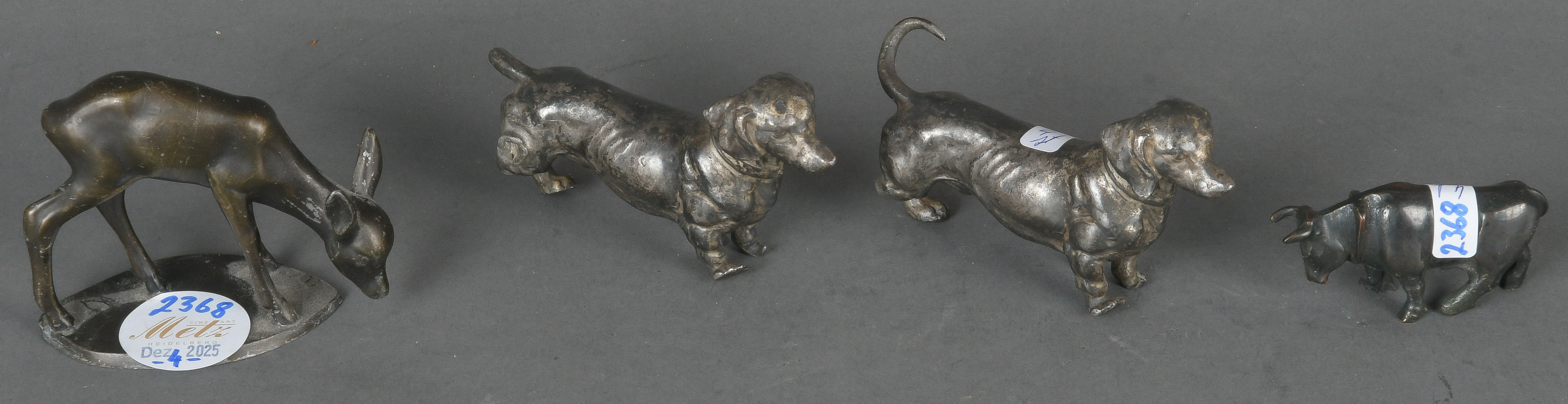 - Katalog-Nr: 2368Vier Tierfiguren: Zwei Dackel, ein Rehkitz und ein Ochse. Deutsch 20. Jh. Bronze / Metall, H=3 bis 6,5 cm. (beide Dackel besch.)o.L.