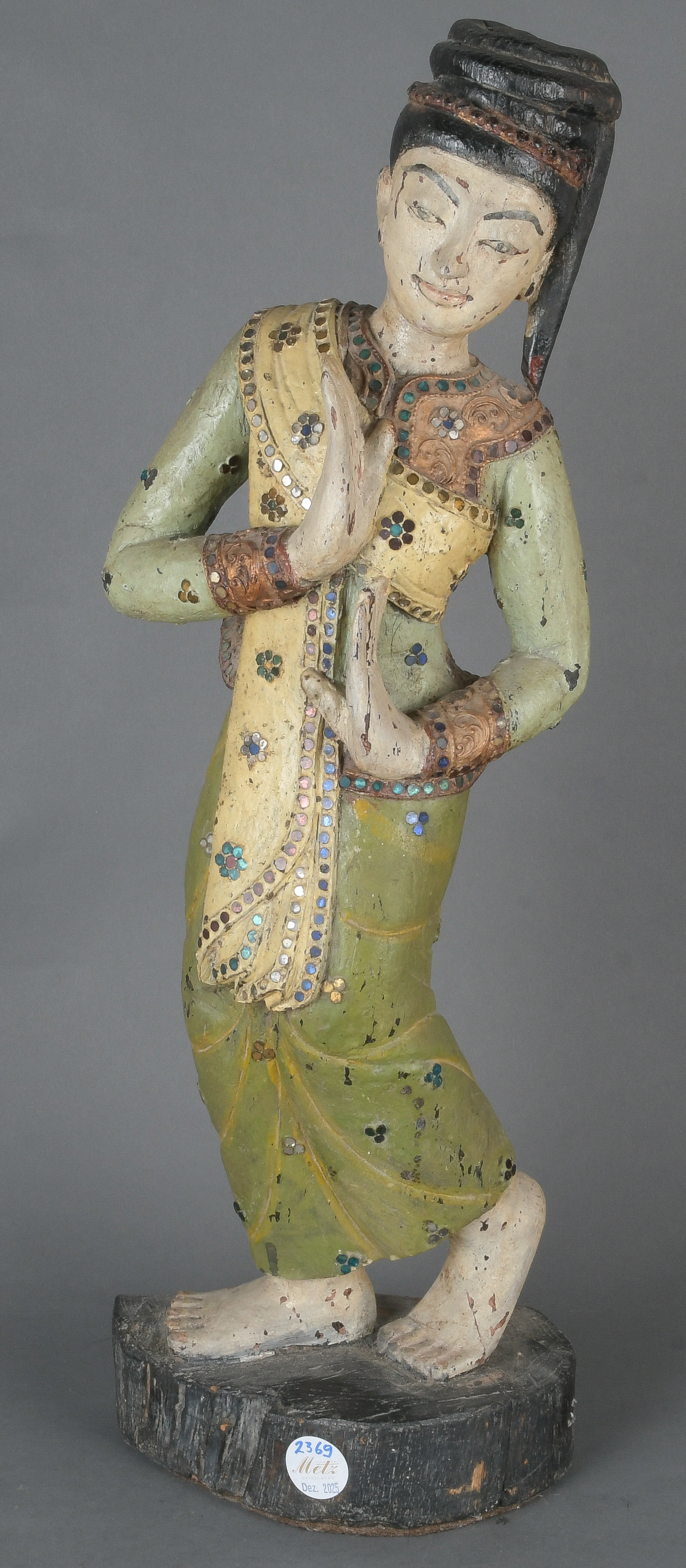 - Katalog-Nr: 2369Tempeltänzerin. Asien. Massivholz, bunt bemalt, teilw. besetzt mit bunten Steinen, H=65 cm. (besch.)o.L.