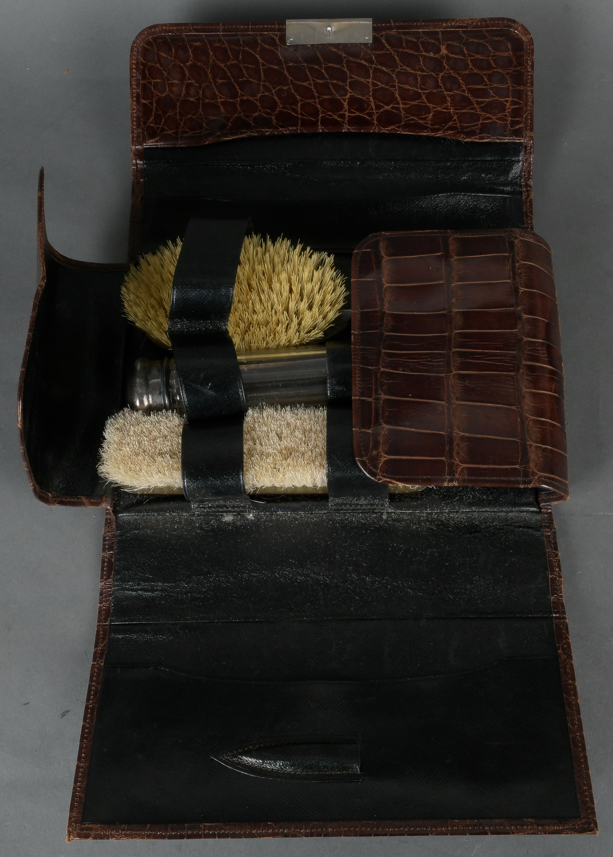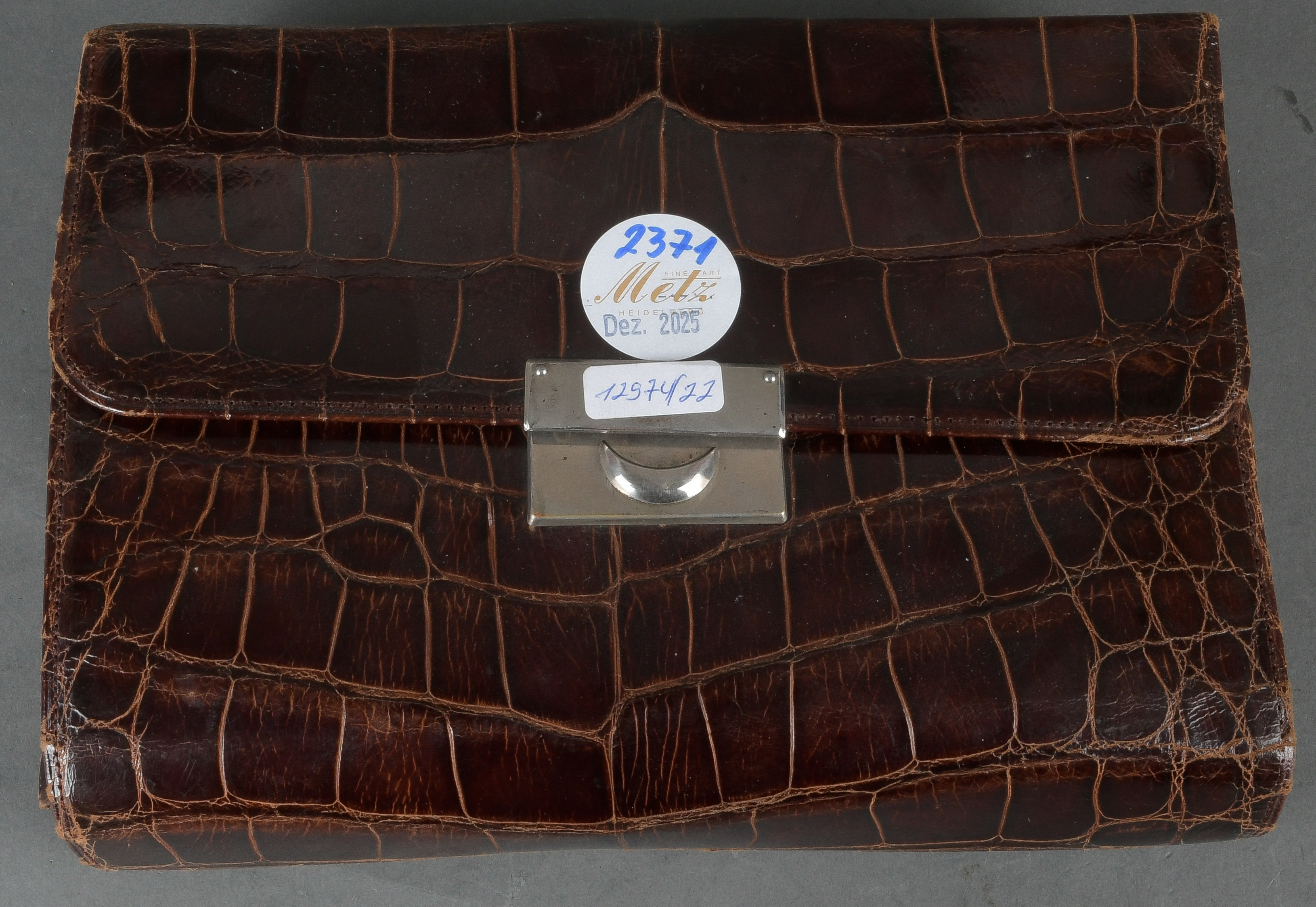 - Katalog-Nr: 2371Kulturtasche. Wohl England 20. Jh. Reptilienleder; rechteckig aufklappbar mit Inhalt, u.a. Bürsten, Kamm und Glasgefäß, H=16,5 cm, B=22,5 cm, T=4,5 cm.o.L.