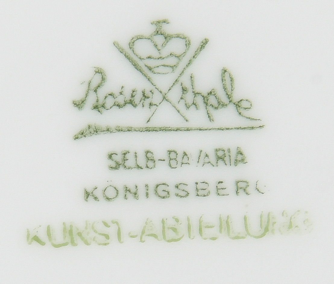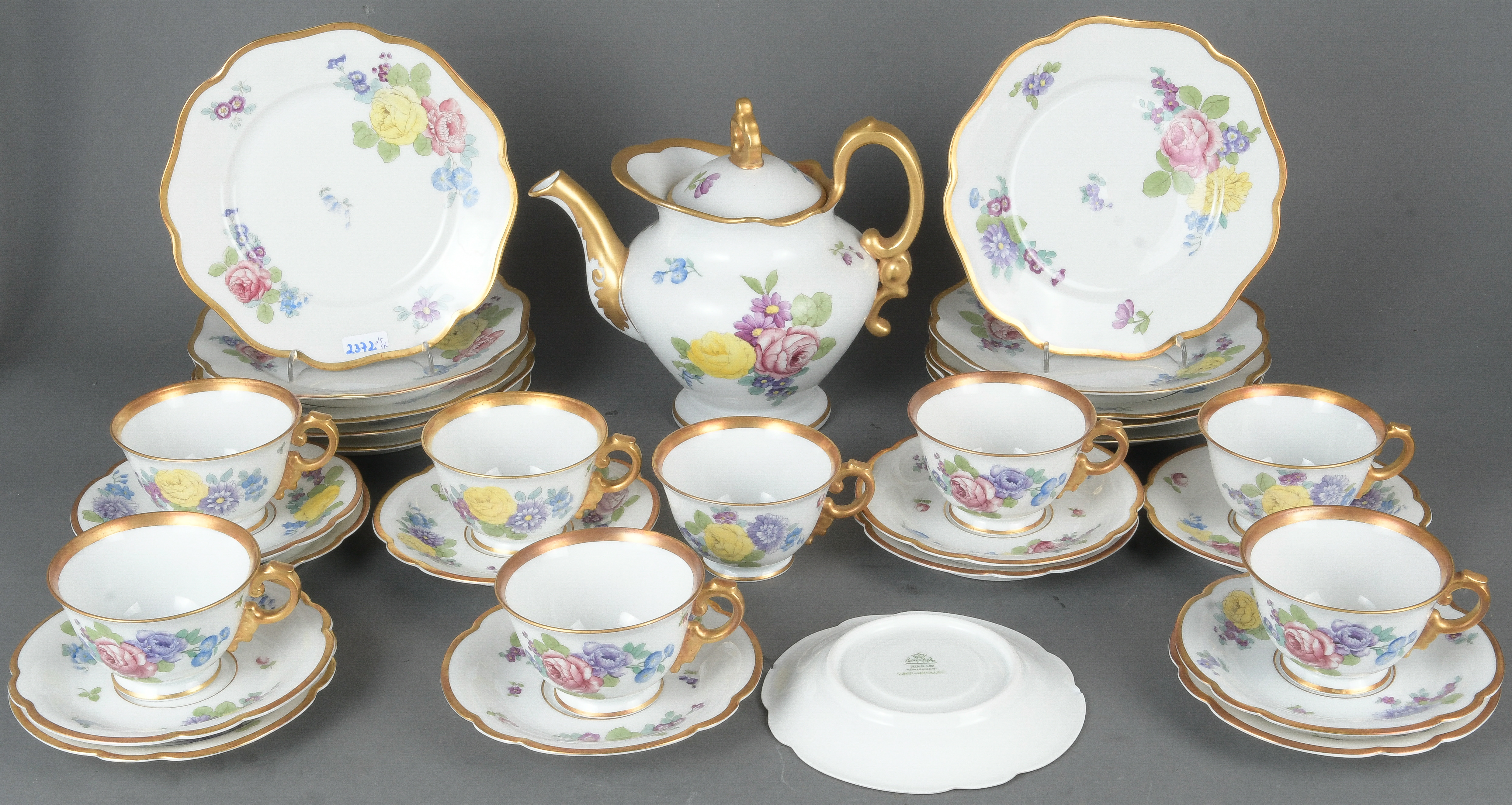 - Katalog-Nr: 237225-tlgs. Teeservice „Königsberg“. Rosenthal 20. Jh. Porzellan, bunt bemalt, Goldrand; am Boden grüne Stempelmarke. Bestehend aus: Eine Teekanne (H=19 cm), acht Tassen mit zwölf Unterschalen und zwölf Kuchenteller (D=je 19,8 cm). (best.)o.L.