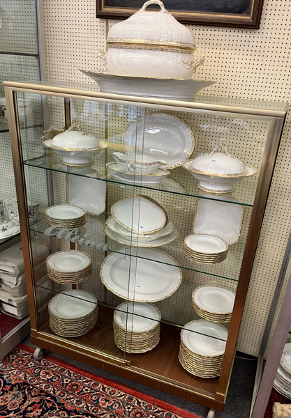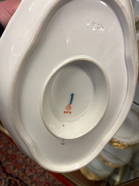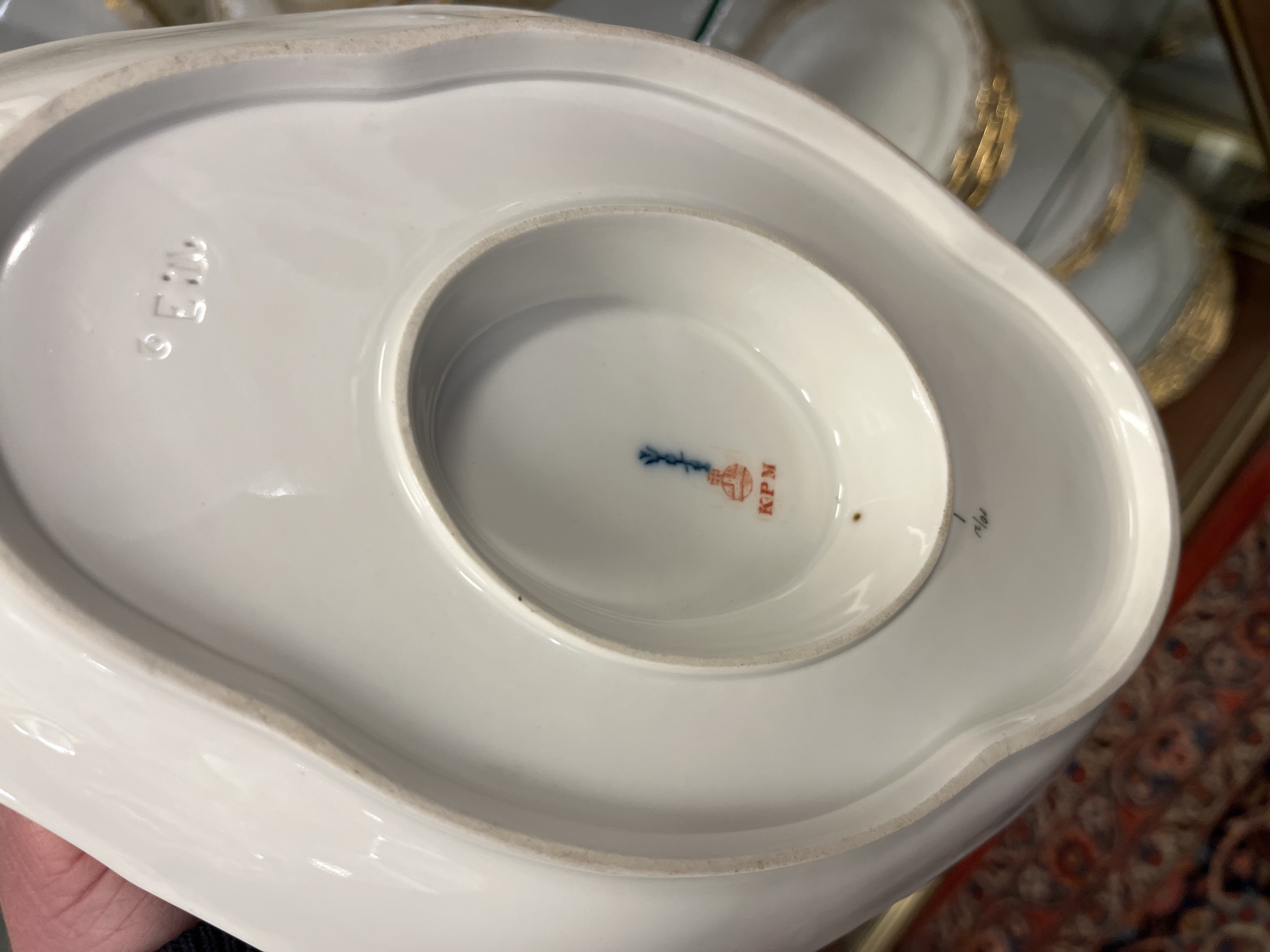 - Katalog-Nr: 237372-tlgs. Speiseservice. Berlin 20. Jh. Porzellan, weiß glasiert, mit Goldrand; am Boden unterglasurblaue Szeptermarke. Bestehend aus: 23 Speiseteller (D=je 25 cm), zwölf Suppenteller (D=je 23 cm), zwölf Salatteller (D=je 21,5 cm), zwölf Butterteller (D=je 18 cm), ein Paar runde Terrinen (H=je 17 cm, D=je 28 cm), eine ovale Terrine (H=39 cm, B=25 cm, T=28 cm), zwei runde Schalen (D=31 / 35 cm), ein Paar quadratische Schüsseln (H=je 5 cm, B=je 21 cm), eine Saucière (H=8 cm, B=27 cm, T=19 cm) und sechs ovale Platten (25,5 x 18 bis 51 x 28 cm). (best.)o.L.