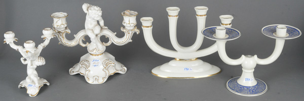 - Katalog-Nr: 2351Vier Girandolen. Hutschenreuther / Rosenthal 20. Jh. Porzellan, teilw. gold gehöht und dekoriert; am Boden gemarkt, H=17 bis 23 cm. (besch.)o.L.