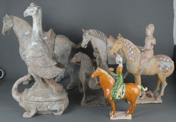 - Katalog-Nr: 2353Fünf Figuren. Asien. Ton, teilw. glasiert. Bestehend aus: Zwei Pferde, zwei Reiter und ein Vogel auf Schildkröte, H=31 bis 56 cm. (besch.)o.L.