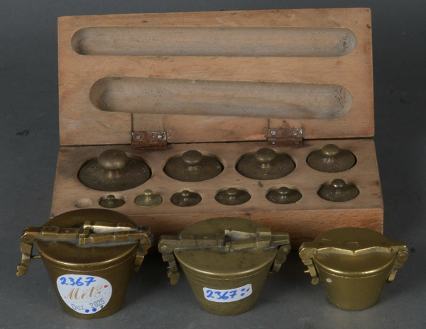 - Katalog-Nr: 2367Drei Gewichtssätze. Deutsch 18. Jh. Bronze; dazu Gewichte im Holzkasten. (teilw. fehlen Gewichte)o.L.