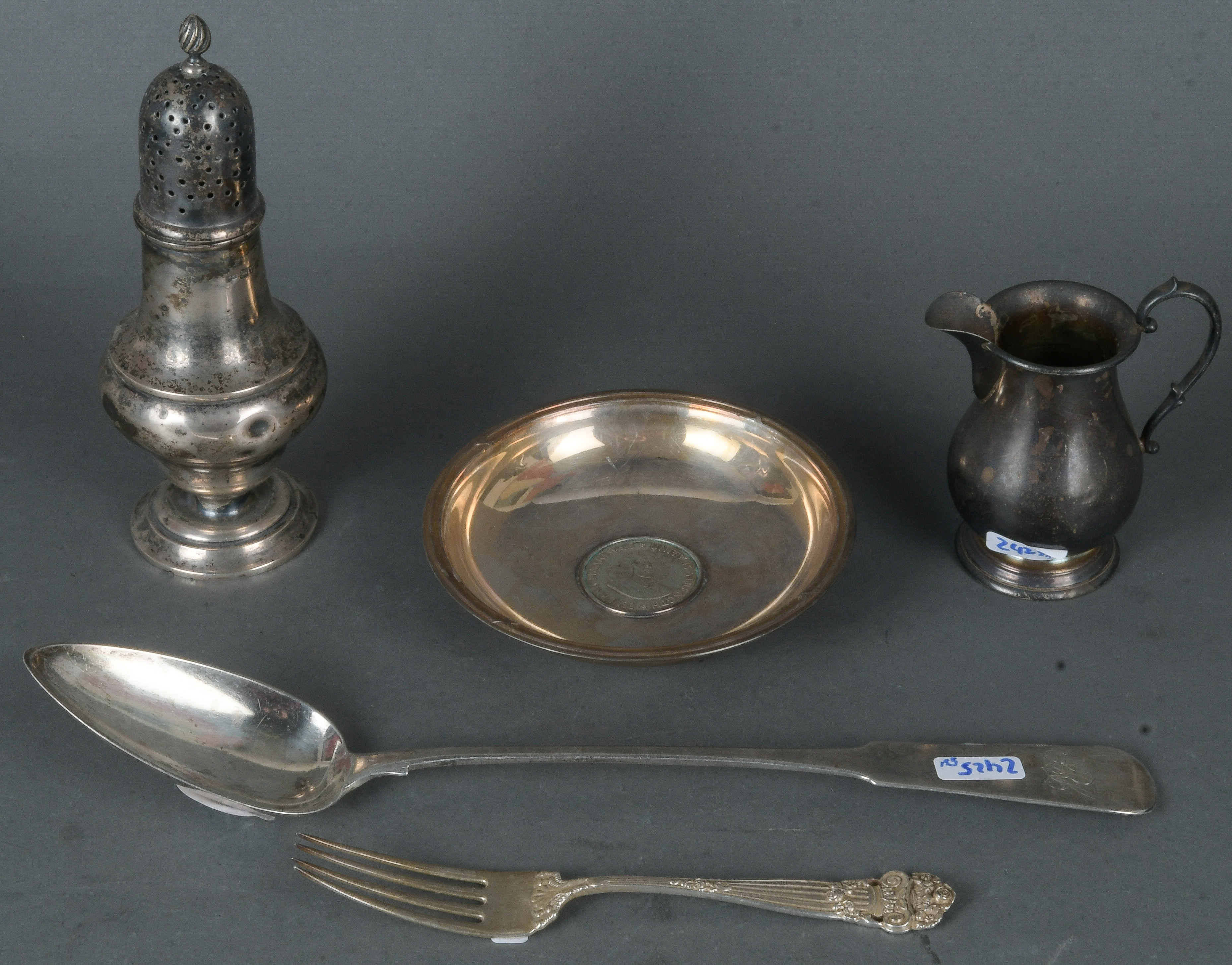 - Katalog-Nr: 2425Fünftlgs. Konvolut Silber, ca. 600 g. Bestehend aus: Eine Gabel, ein Kartoffellöffel, ein Milchgießer, ein Münzteller und ein Zuckerstreuer.o.L.