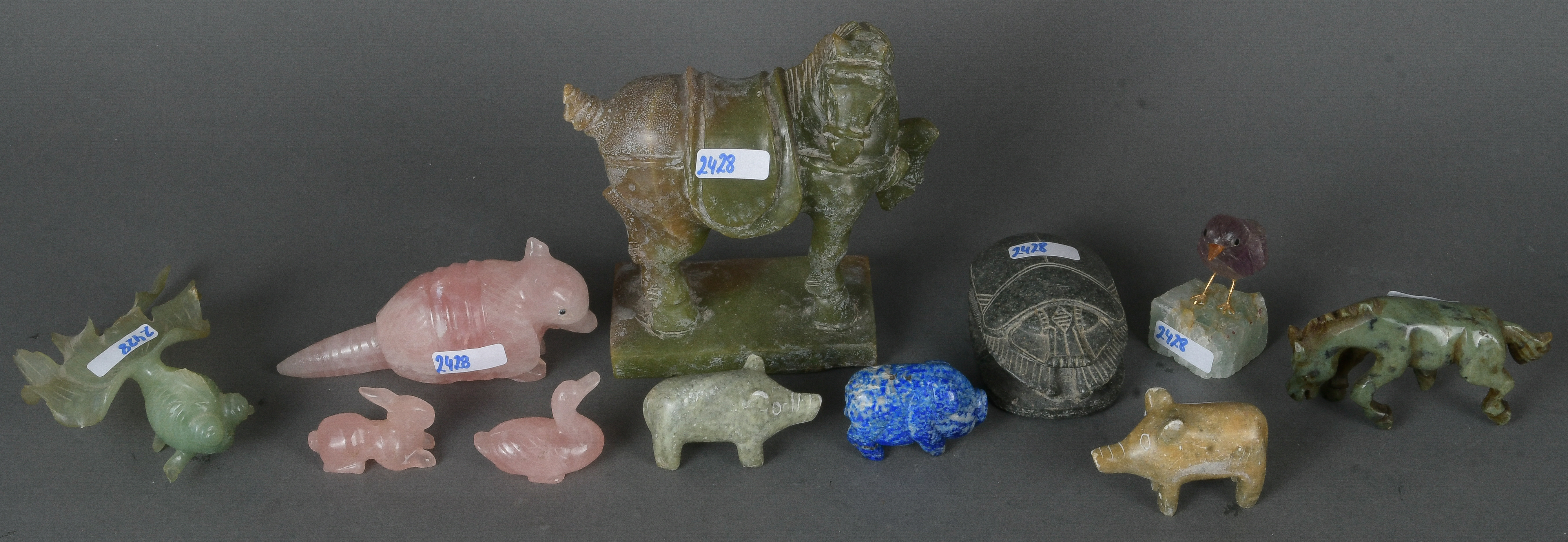 - Katalog-Nr: 2428Elf Tierfiguren. Asien. Jade / Lapislazuli / Speckstein u.a., geschnitzt. Bestehend aus: Ein Fisch, ein Hase, ein Gürteltier, eine Ente, zwei Pferde, drei Schweine, ein Skarabäus und ein Vogel, 5 bis 13 cm. (besch. / rest.)o.L.