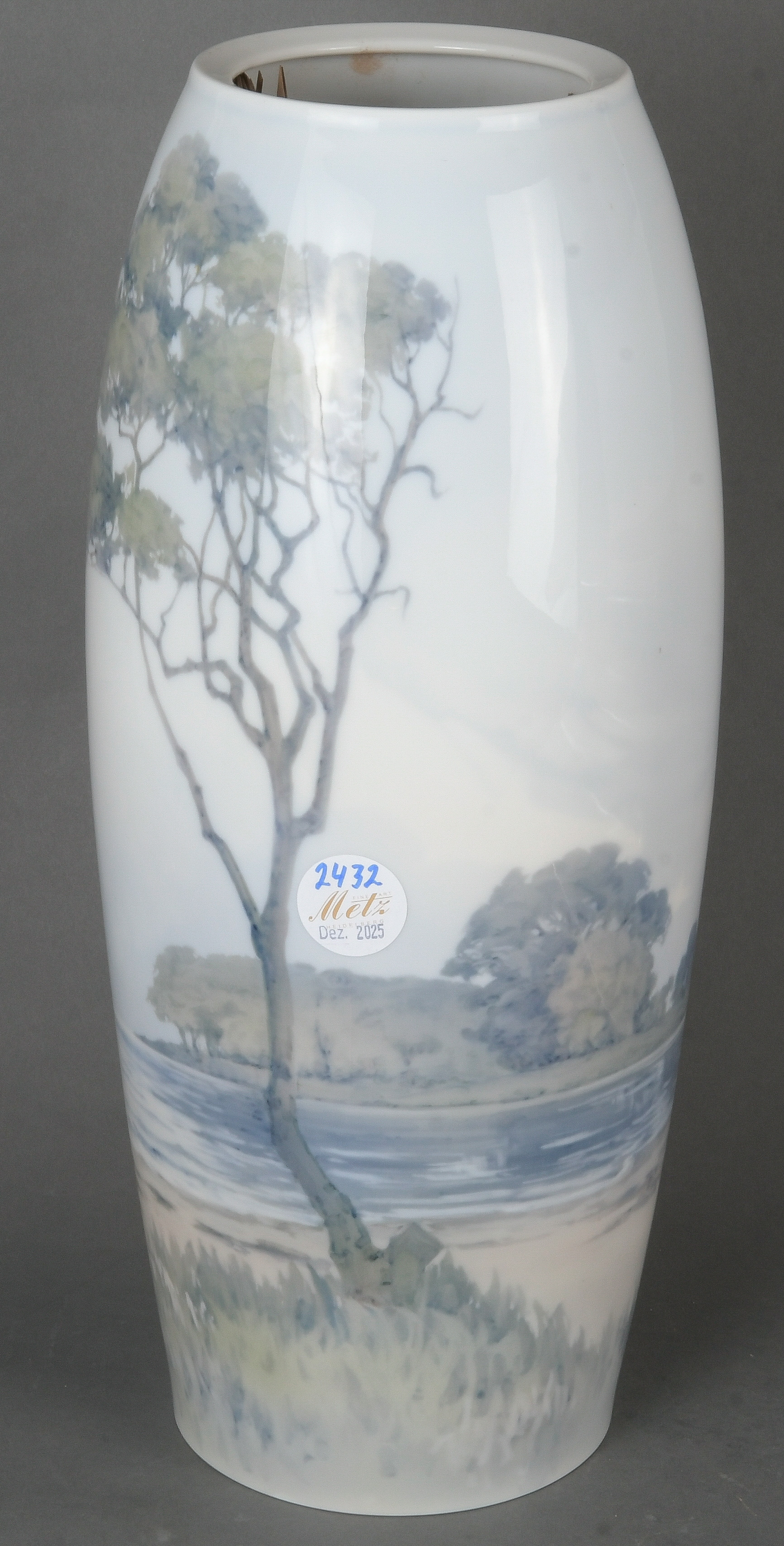 - Katalog-Nr: 2432Große Vase. Bing & Grøndahl 20. Jh. Porzellan, bunt bemalt mit Uferlandschaft und Segelbooten; am Boden gemarkt mit Ziffer „6353“ und monogr. „AS“, H=41 cm.o.L.
