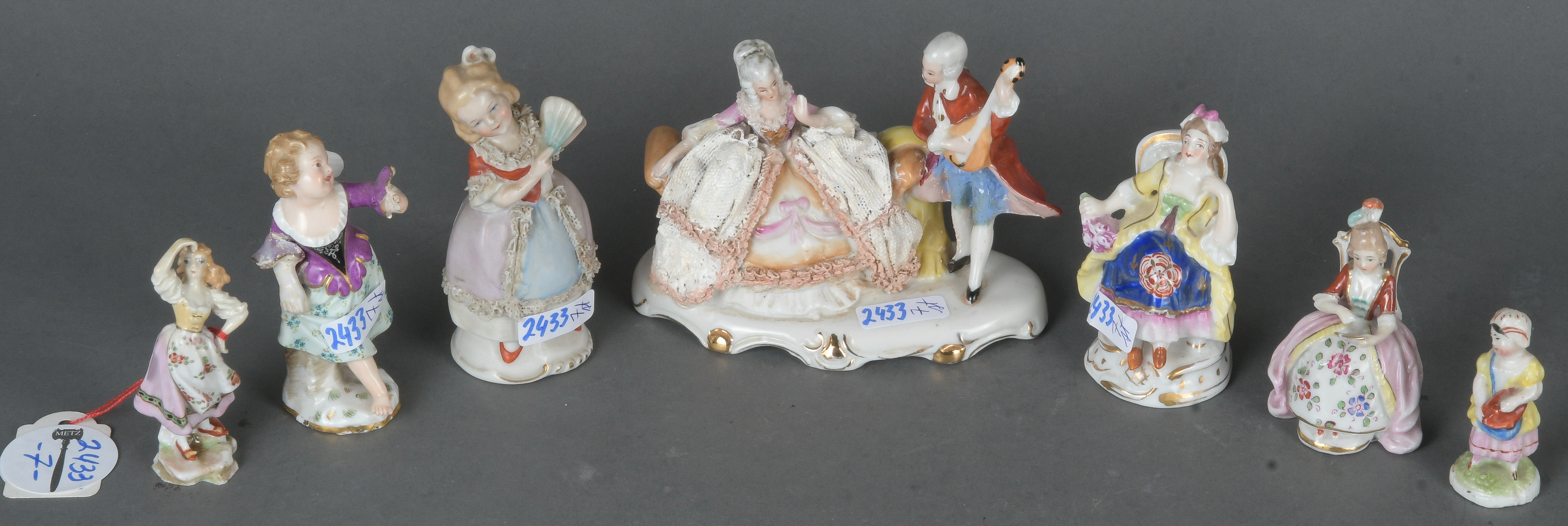 - Katalog-Nr: 2433Sieben Figuren, u.a. Dresden / Gräfenthal / Thüringen 20. Jh. Porzellan, bunt bemalt; am Boden gemarkt, H=5,5 bis 9,5 cm. (besch.)o.L.