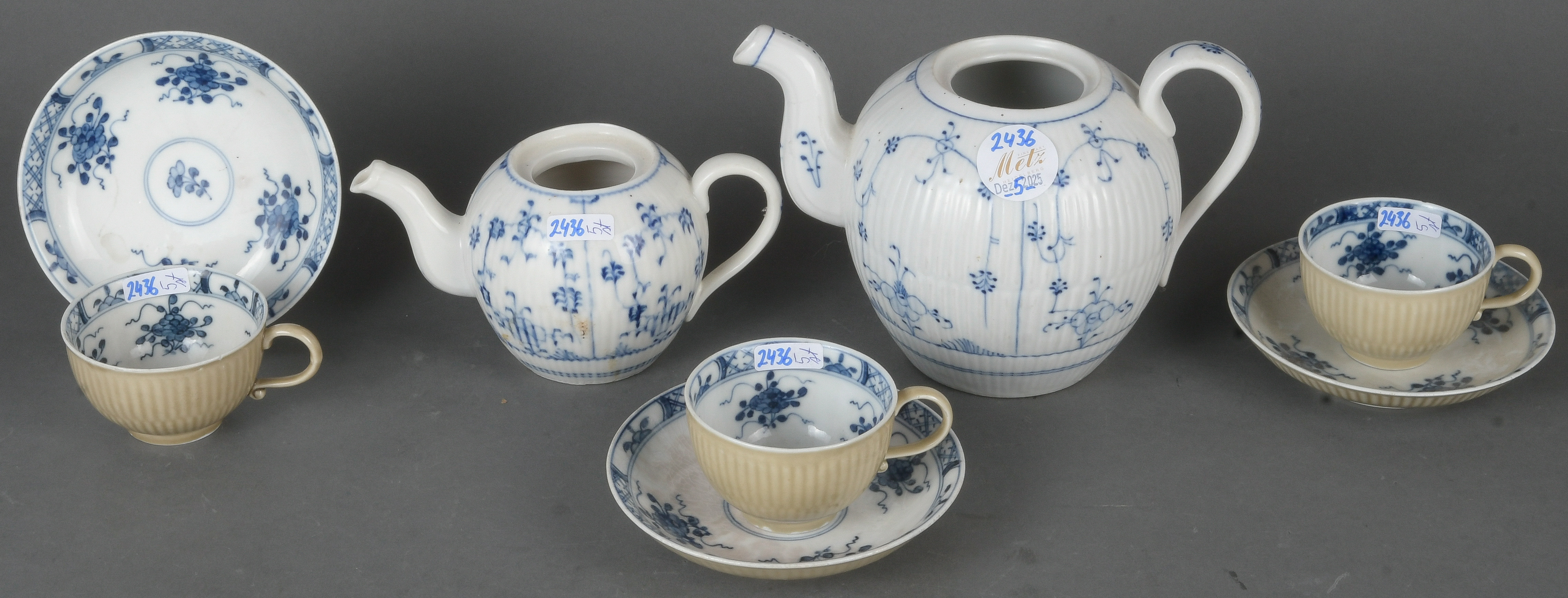 - Katalog-Nr: 2436Fünftlgs. Konvolut. Rauenstein 18. Jh. Porzellan, unterglasurblau bemalt mit Strohheckenmuster; am Boden gemarkt. Bestehend aus: Drei Tassen mit Unterschalen und zwei Kannen ohne Deckel, H=8,5 bis 13,5 cm.o.L.