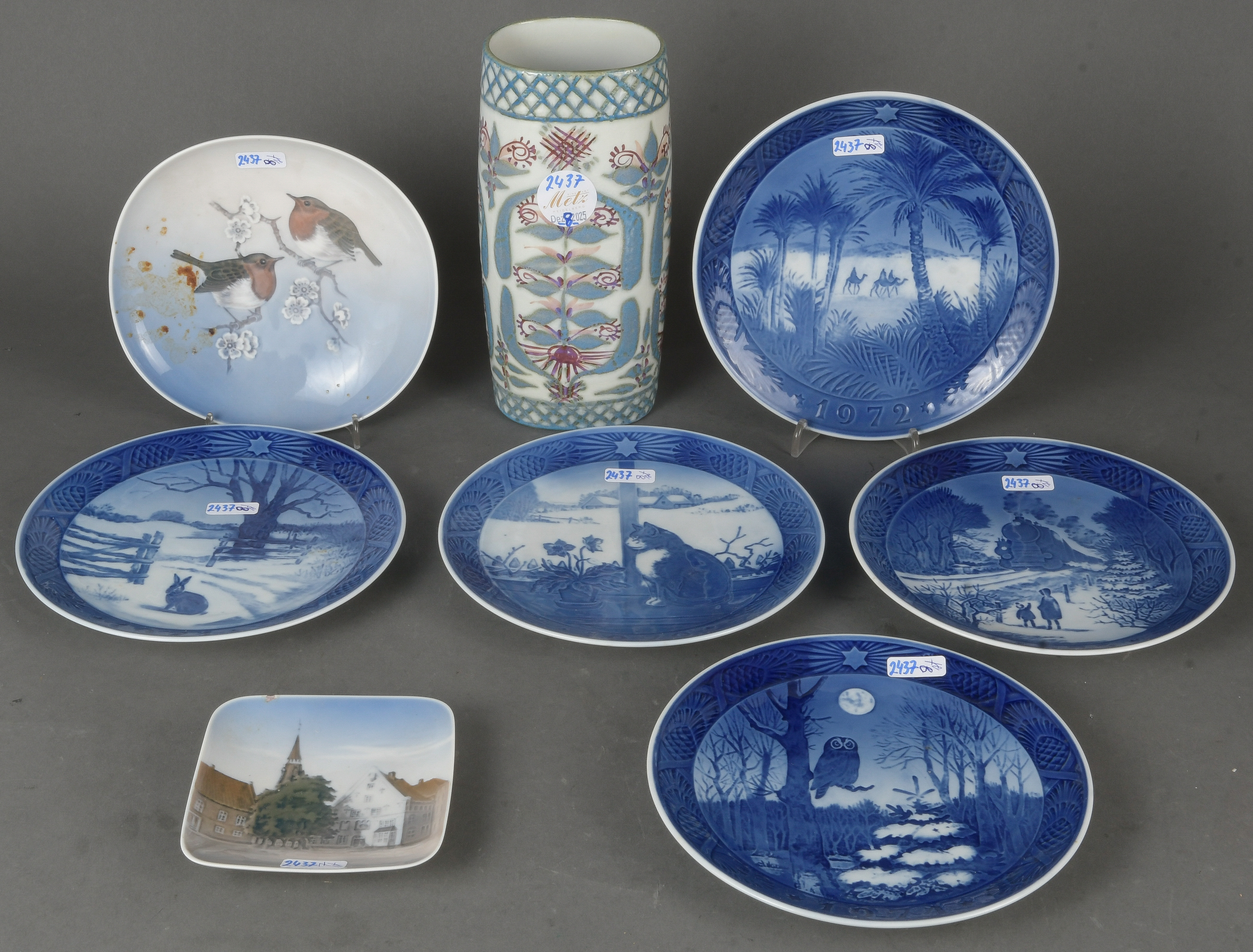- Katalog-Nr: 2437Achttlgs. Konvolut. Royal Copenhagen 20. Jh. Porzellan, bunt bemalt; am Boden gemarkt. Bestehend aus: Eine Vogelschale (H=3 cm, B=17 cm, T=15,5 cm), eine quadratische Schale (H=2 cm, B=10,5 cm), fünf Weihnachtsteller 1970-1974 (D=je 18,5 cm) und eine Vase „Tenera Serie“, Entwurf von Marianne Johanson.o.L.