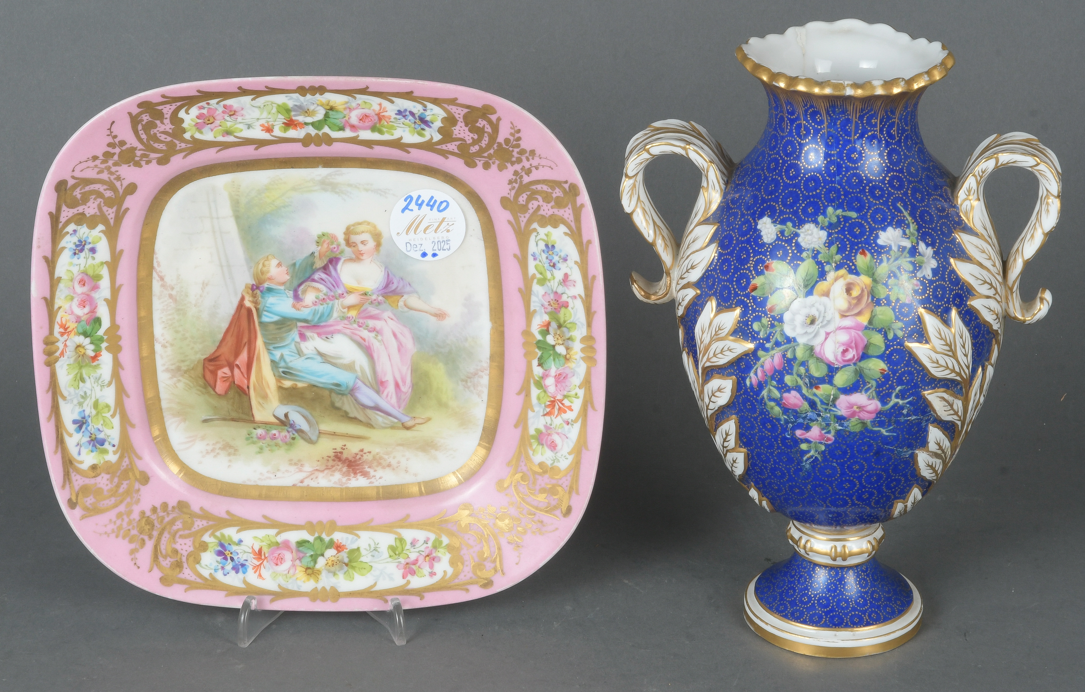 - Katalog-Nr: 2440Henkelvase und Schale. Sèvres 20. Jh. Porzellan, bunt bemalt mit Floraldekor bzw. galanter Szene; am Boden gemarkt, H=23,5 cm / H=3,5 cm, B=22 cm.o.L.