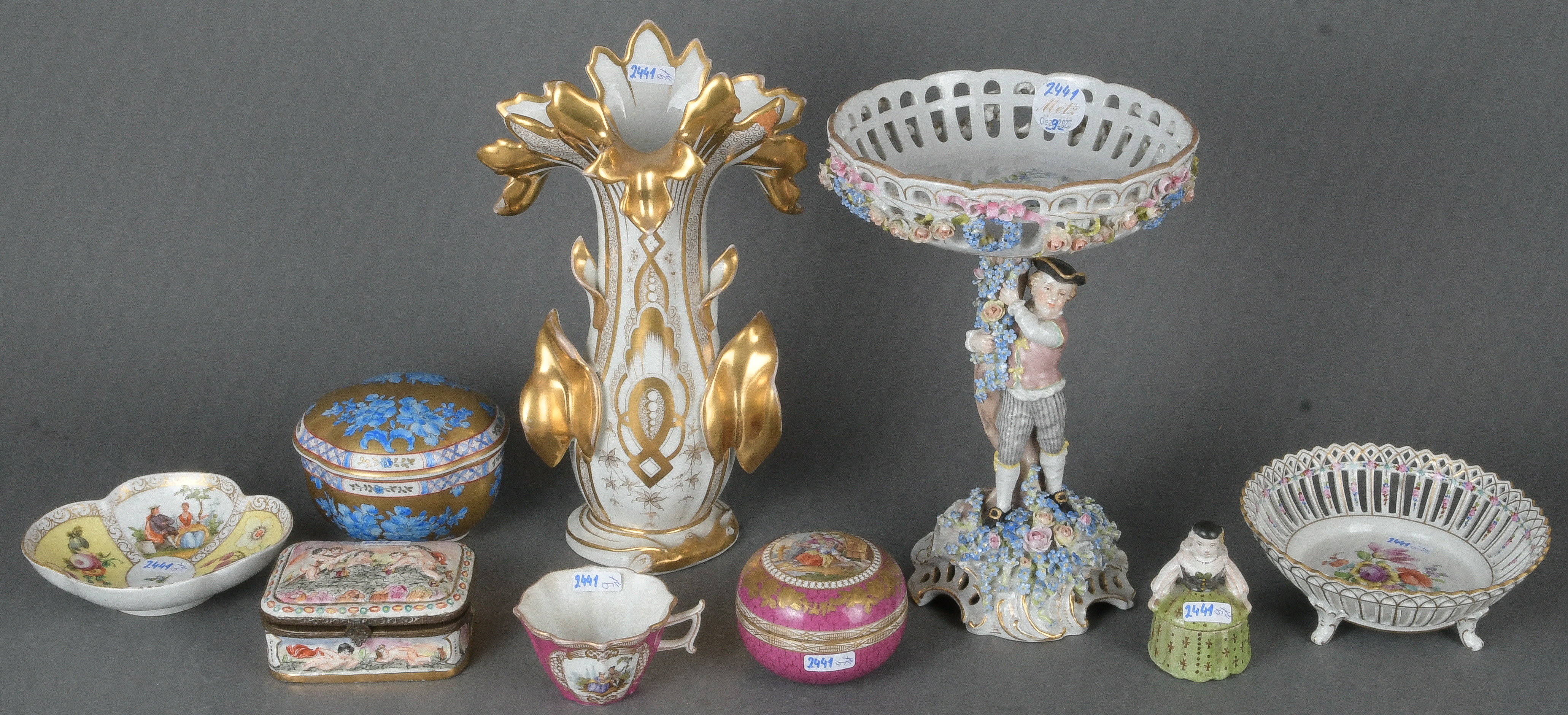 - Katalog-Nr: 2441Neuntlgs. Konvolut, u.a. Böhmen / Dresden 20. Jh. Porzellan, bunt bemalt; am Boden gemarkt. Bestehend aus: Zwei Deckeldosen, eine Figur, eine Fußschale, eine Tasse, eine Unterschale, eine Tabatière, ein Tafelaufsatz und eine Vase, H=3,5 bis 28,5 cm, D=4,5 bis 19 cm.o.L.