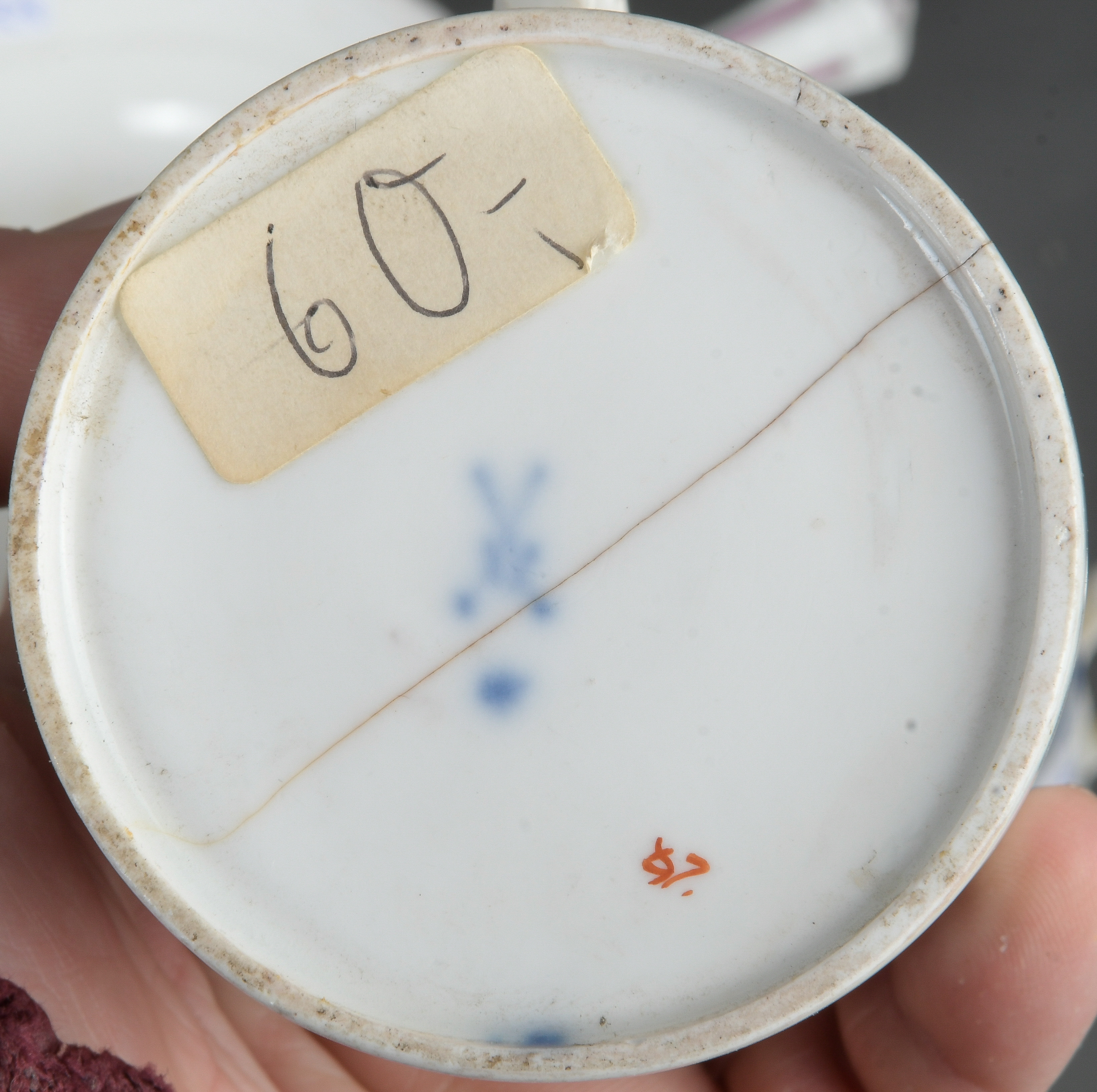 - Katalog-Nr: 2435Siebentlgs. Konvolut Porzellan aus unterschiedlichen Manufakturen, 19./20. Jh., bunt bemalt mit Floraldekor bzw. unterglasurblau bemalt mit Zwiebelmuster: Eine Unterschale, Wien (D=13,5 cm); eine ovale Schale, Wien-Augarten (H=3,5 cm, B=16 cm, T=13 cm), eine Tasse mit Unterschale sowie eine Unterschale, Meissen (D=14,5 cm), eine Girandole, Meissen (H=31 cm) sowie eine Plakette (10 x 13 cm) und ein Kerzenleuchter (H=14 cm) jeweils Böttgerporzellan, Meissen.o.L.