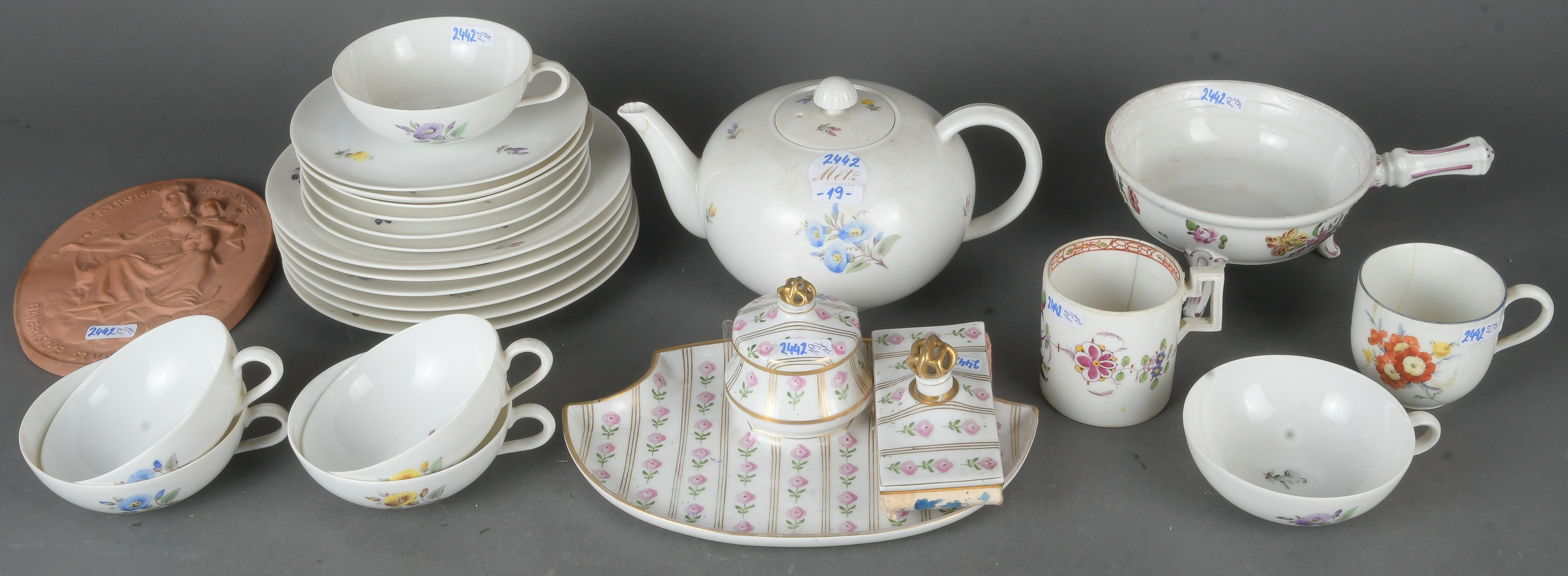 - Katalog-Nr: 2442Konvolut Porzellan aus unterschiedlichen Manufakturen, 18. bis 20. Jh., je bunt bemalt mit Blumen oder Vögeln: Ein Stielpfännchen, Wien (H=8 cm, D=14,5 cm); zwei Tassen, Meissen (besch.); ein Tintenfass (H=8,5 cm, B=22 cm, T=14,5 cm) mit Tintenlöscher (H=10,5 cm), eine Teekanne, vier Tassen mit sechs Unterschalen und sechs Kuchenteller (D=19,5 cm), jeweils Nymphenburg; sowie eine Plakette der „Bayerischen Studentenhilfe“, Entwurf J. Wackerle.o.L.