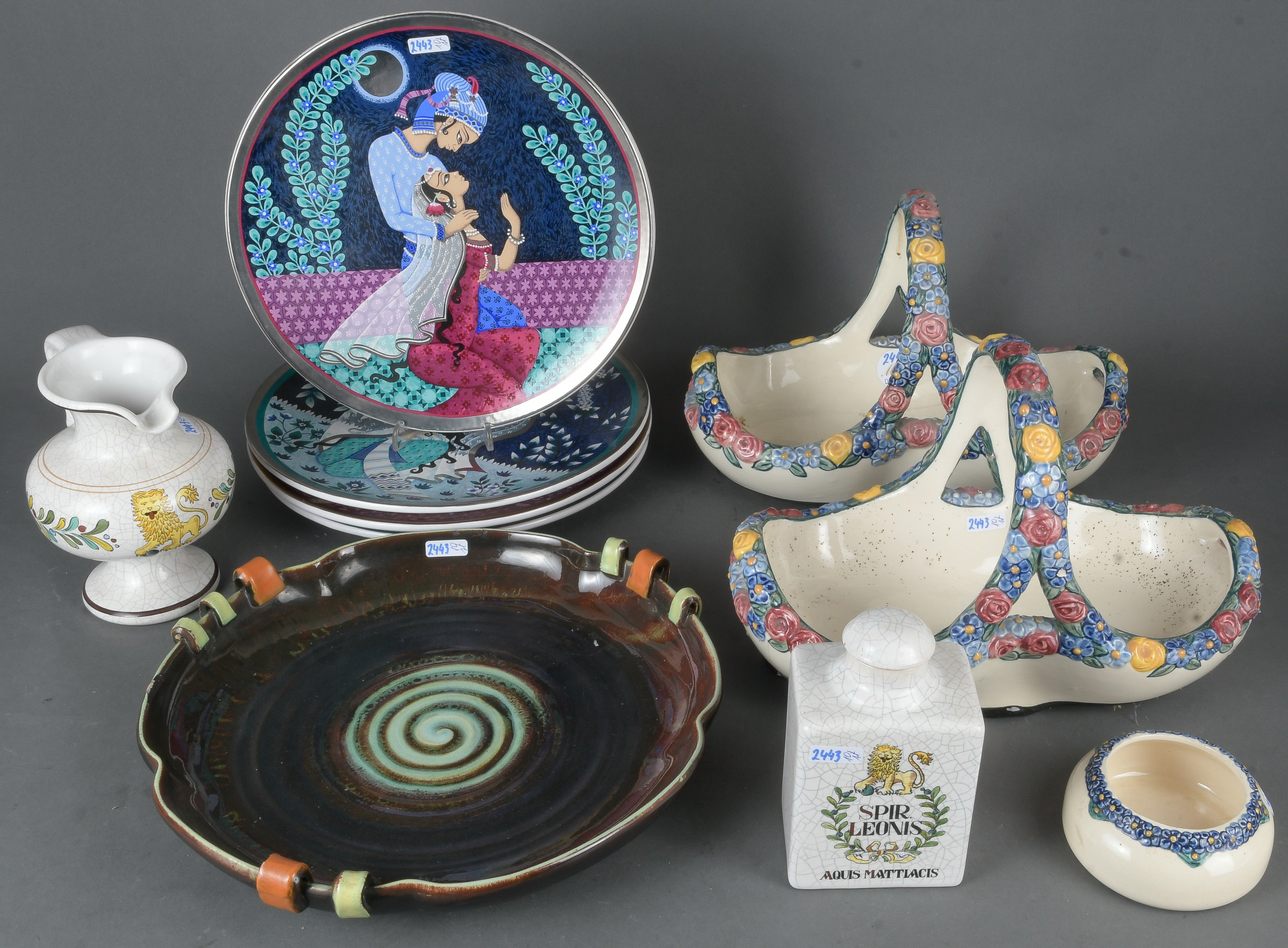 - Katalog-Nr: 2443Zehntlgs. Konvolut Karlsruher Majolika des 20. Jhs. Irdengut, bunt bemalt; u.a. Entwurf Wilhelm Süß. Bestehend aus: Zwei Henkelkörbe, eine kleine und eine große Schale, eine Schenkkanne, eine Teedose und vier Teller, H=4 bis 21 cm, D=10 bis 31 cm.o.L.