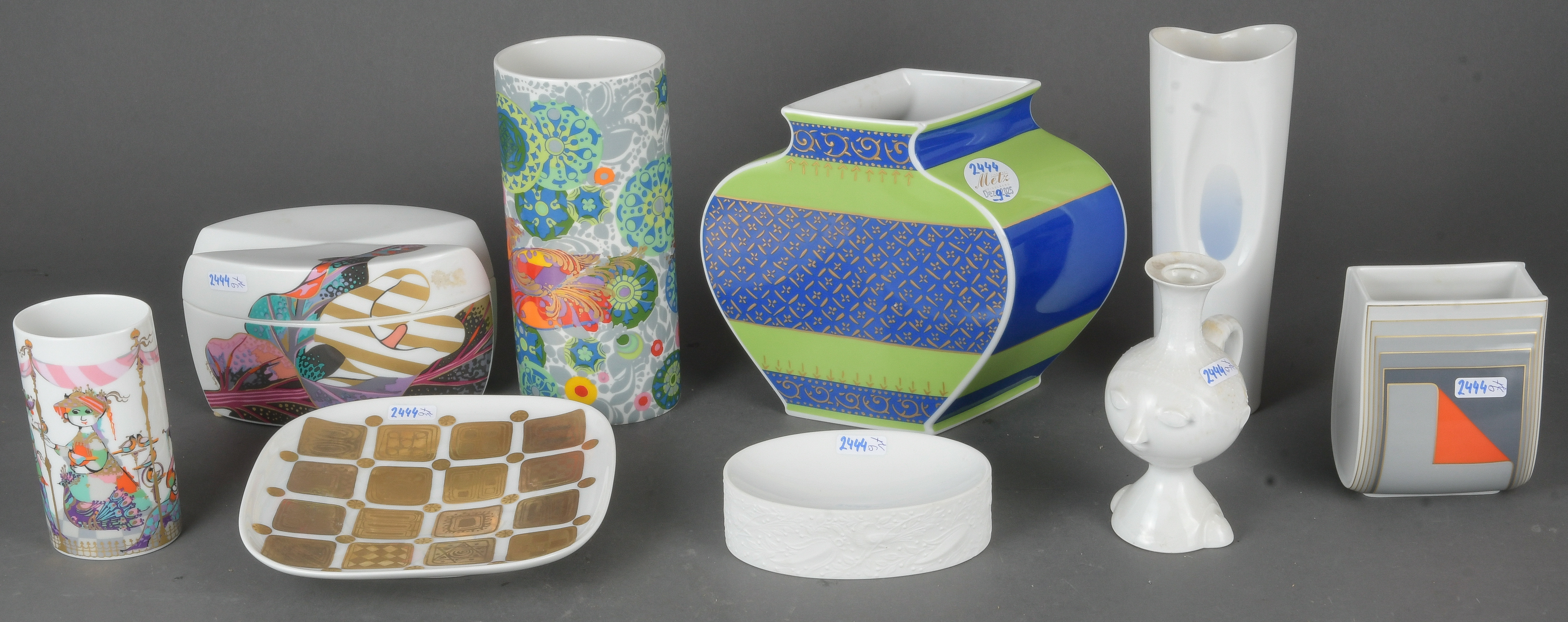 - Katalog-Nr: 2444Neun unterschiedliche Formteile. Rosenthal Studio-Line 20. Jh. Porzellan, bunt bemalt; am Boden gemarkt, u.a. Entwurf und sign. Tadag Amano, Christa Häusler-Goltz, Tapio Wirkkala, Björn Wijnblad, J.V.D. Vaart. Bestehend aus: Eine Deckeldose, zwei Schalen und sechs Vasen, H=3 bis 21 cm.o.L.