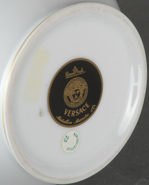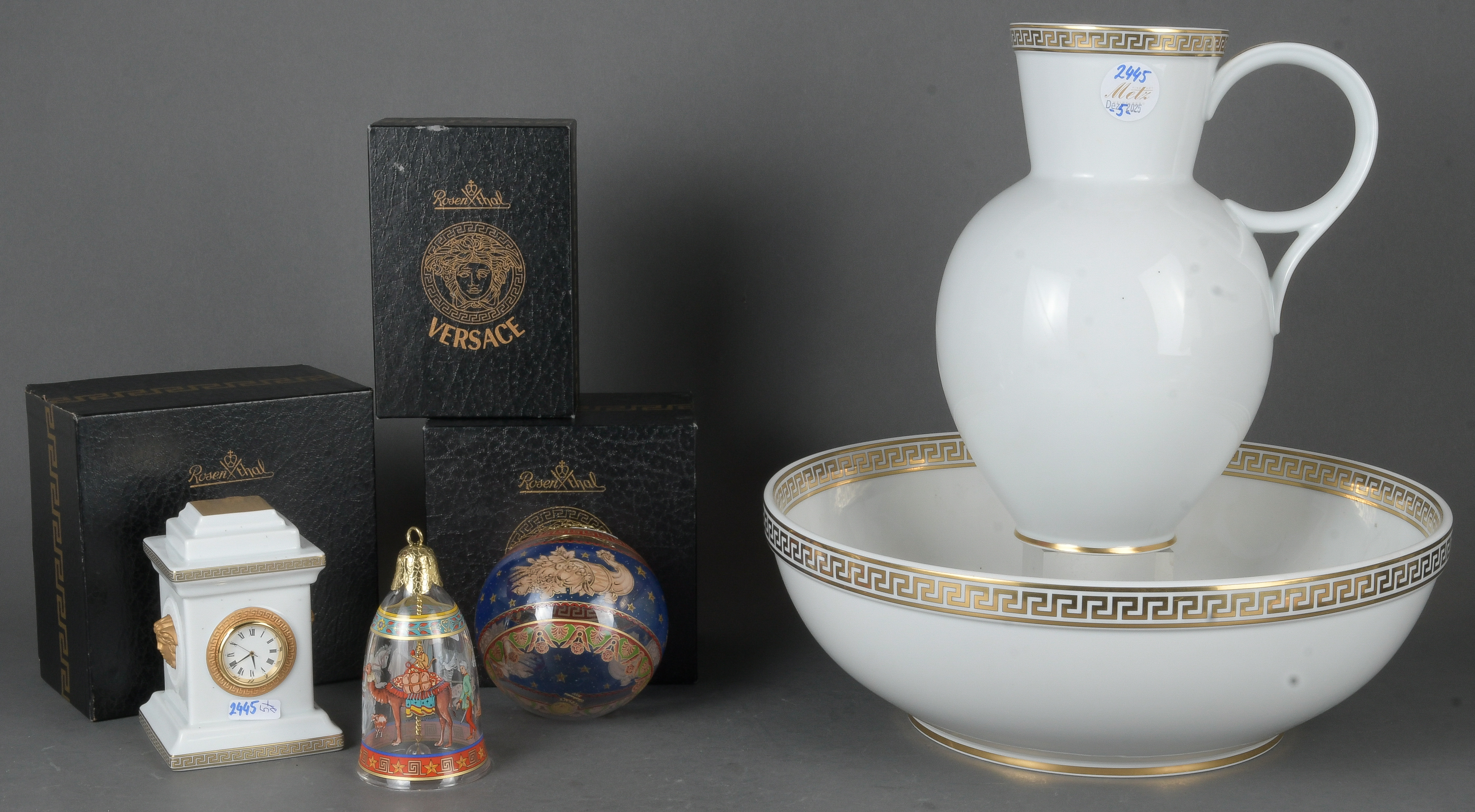 - Katalog-Nr: 2445Fünf unterschiedliche Formteile. Rosenthal 20. Jh. Porzellan, am Boden gemarkt; Entwurf von Gianni Versace, meist in Original-Karton. Bestehend aus: Eine Glocke, eine Lavabo-Garnitur, eine Tischuhr und eine Weihnachtskugel, H=10,5 bis 27 cm, D=6,5 bis 35 cm.o.L.