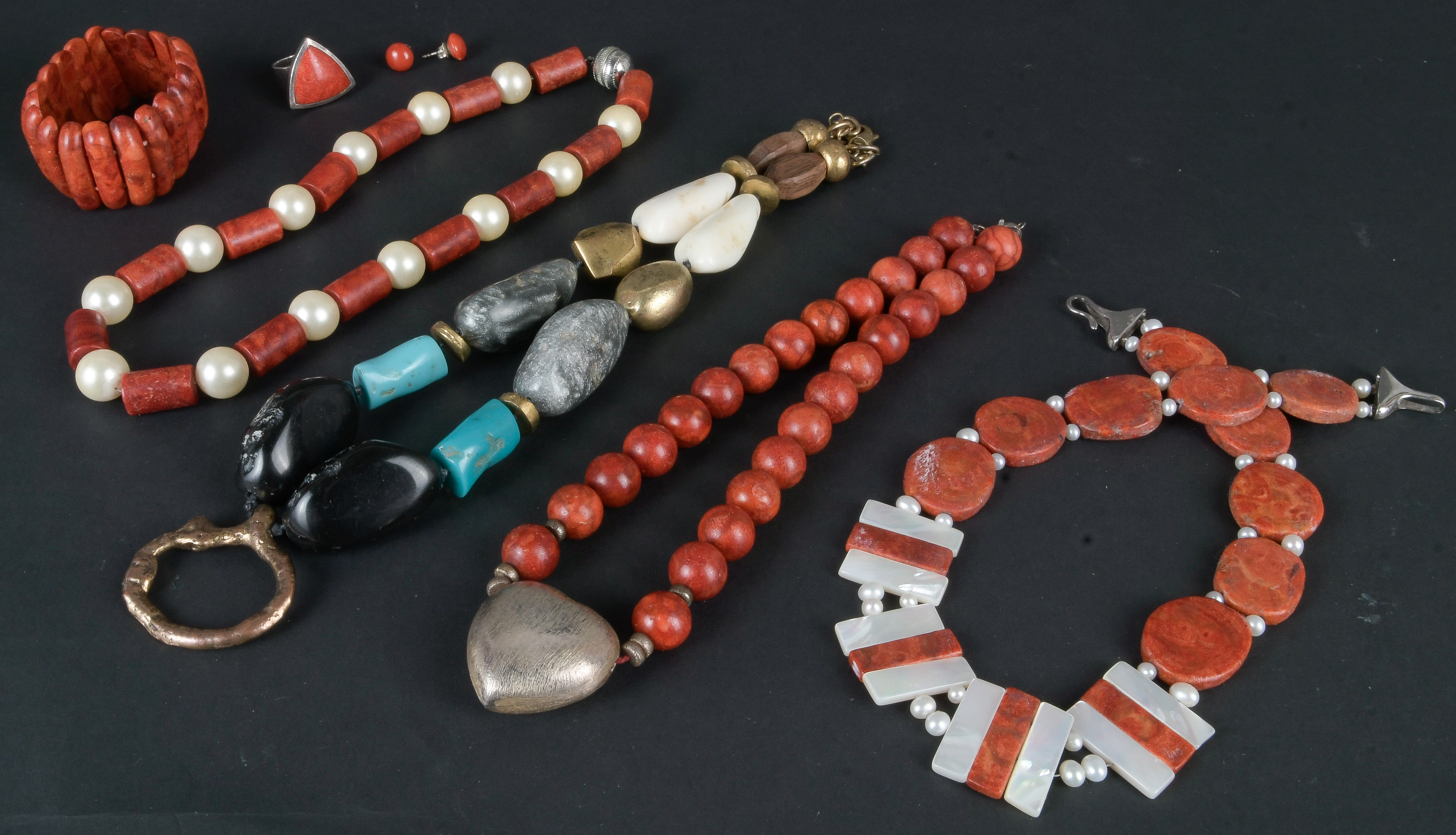 - Katalog-Nr: 2446Konvolut Schmuck, u.a. Armband, Halsketten (L=40 bis 50 cm), Ohrstecker und Ring (Größe 56). Teilw. mit Silberverschluss, teilw. besetzt mit Korallen sowie exotischen Steinen.o.L.