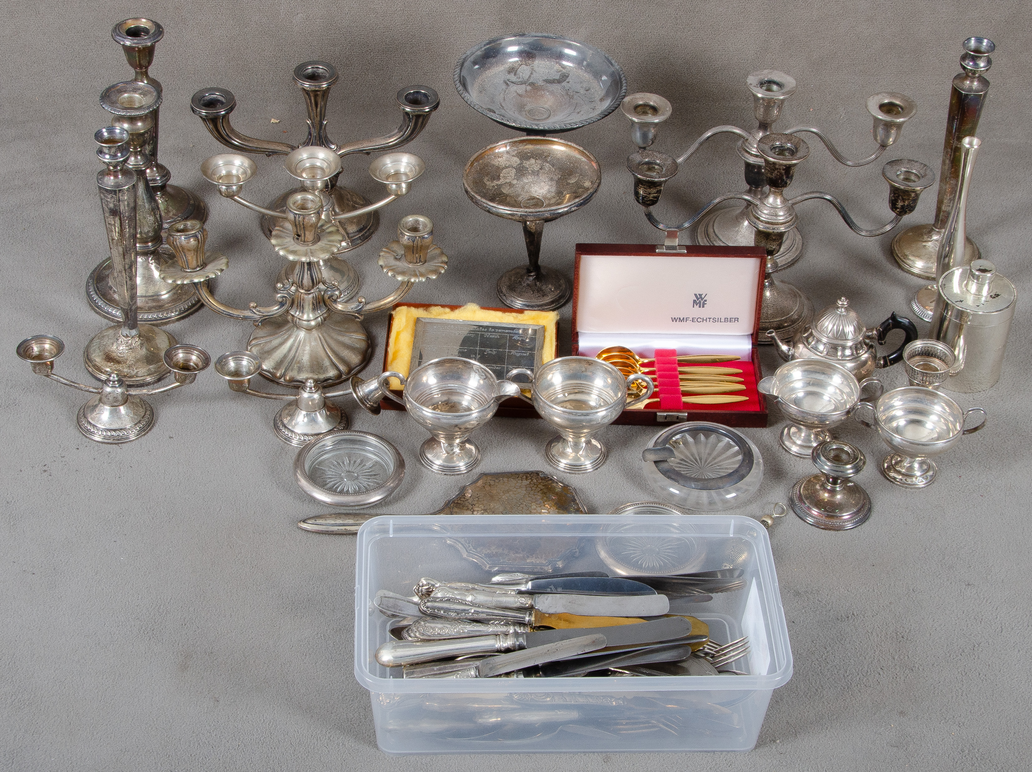 - Katalog-Nr: 2448Großes Konvolut Silber: Aschenbecher, Besteckteile, Fußschalen, Girandolen, Handspiegel, Kerzenleuchter, Milch- und Zuckergefäß, Tafelaufsätze und Untersetzer.o.L.