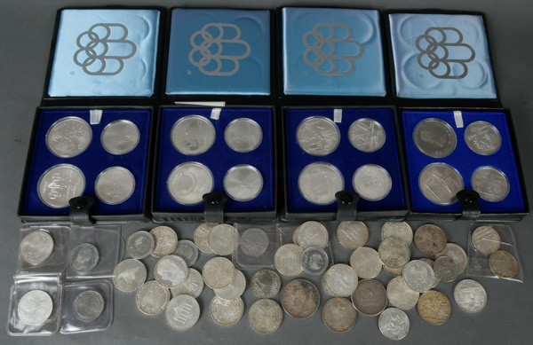- Katalog-Nr: 2426Konvolut Silbermünzen, ca. 1.100 g, u.a. 16 x Olympiade in Etui, DM, Deutsches Reich und Halfdollars.o.L.