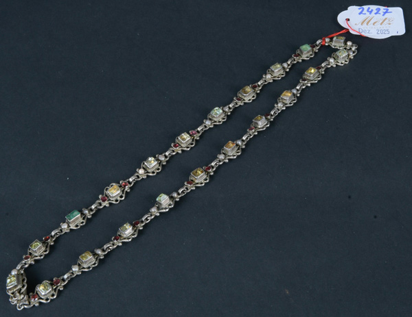 - Katalog-Nr: 2427Halskette. Silber, besetzt mit unterschiedlichen Farbsteinen, Gesamtgewicht ca. 34,5 g, L=44 cm.o.L.