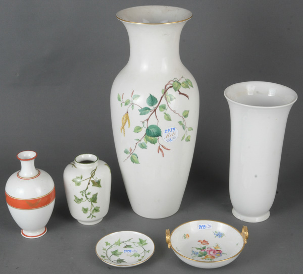 - Katalog-Nr: 2439Sechs unterschiedliche Formteile. Berlin 20. Jh. Porzellan, meist bunt bemalt mit Blattdekor; am Boden unterglasurblaue Szeptermarke. Bestehend aus: Eine kleine Henkelschale (H=3,5 cm, D=13 cm), eine kleine Schale (D=10,5 cm) und vier unterschiedliche Vasen (H=13 bis 39 cm).o.L.