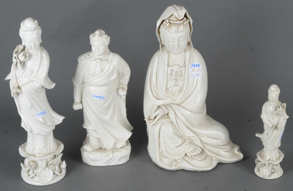 - Katalog-Nr: 2449Bodhisattva, Guanyin und zwei weitere Figuren. Asien. Porzellan, teilw. bunt bemalt, H=18,5 bis 32 cm. (besch.)o.L.