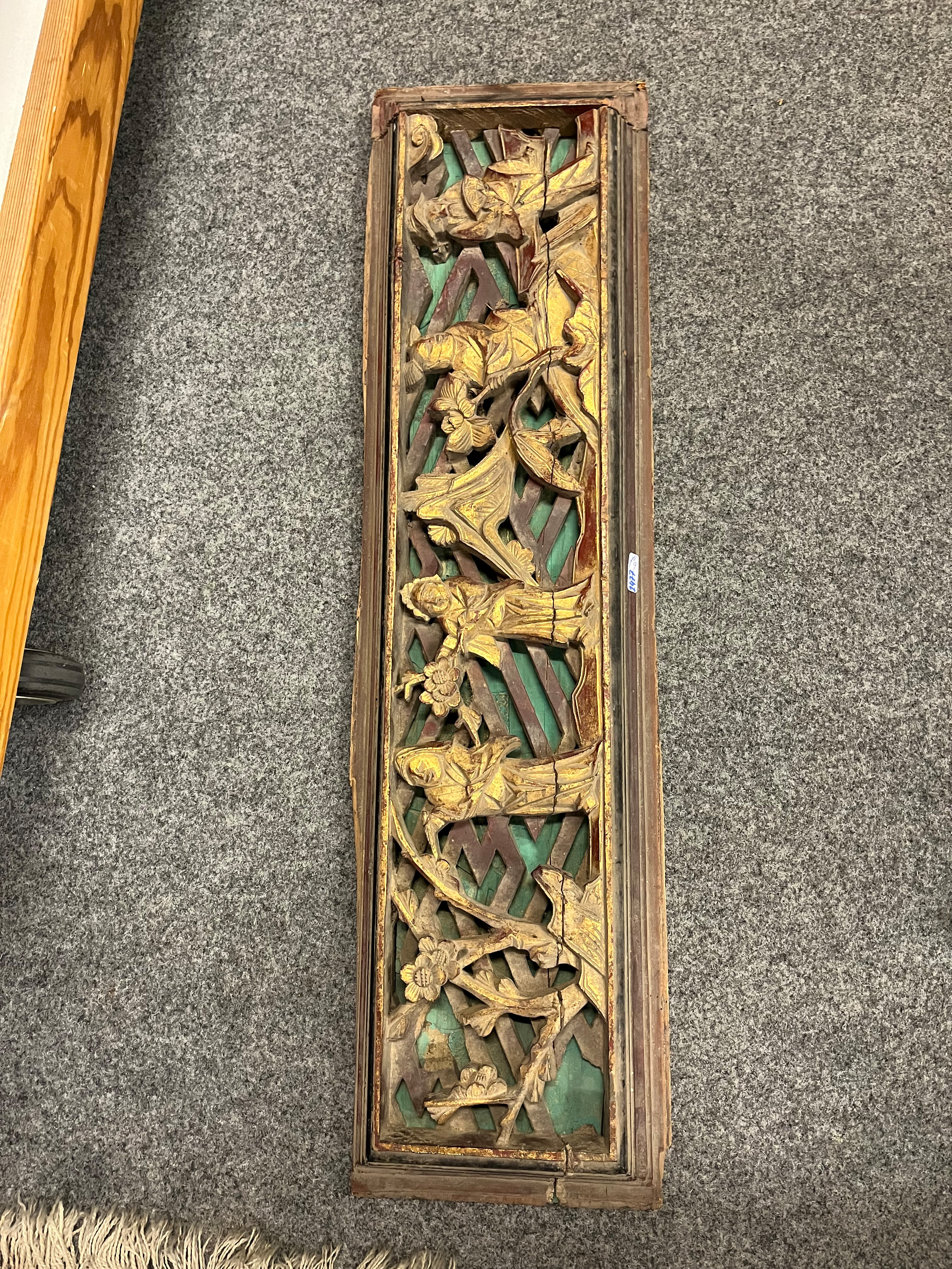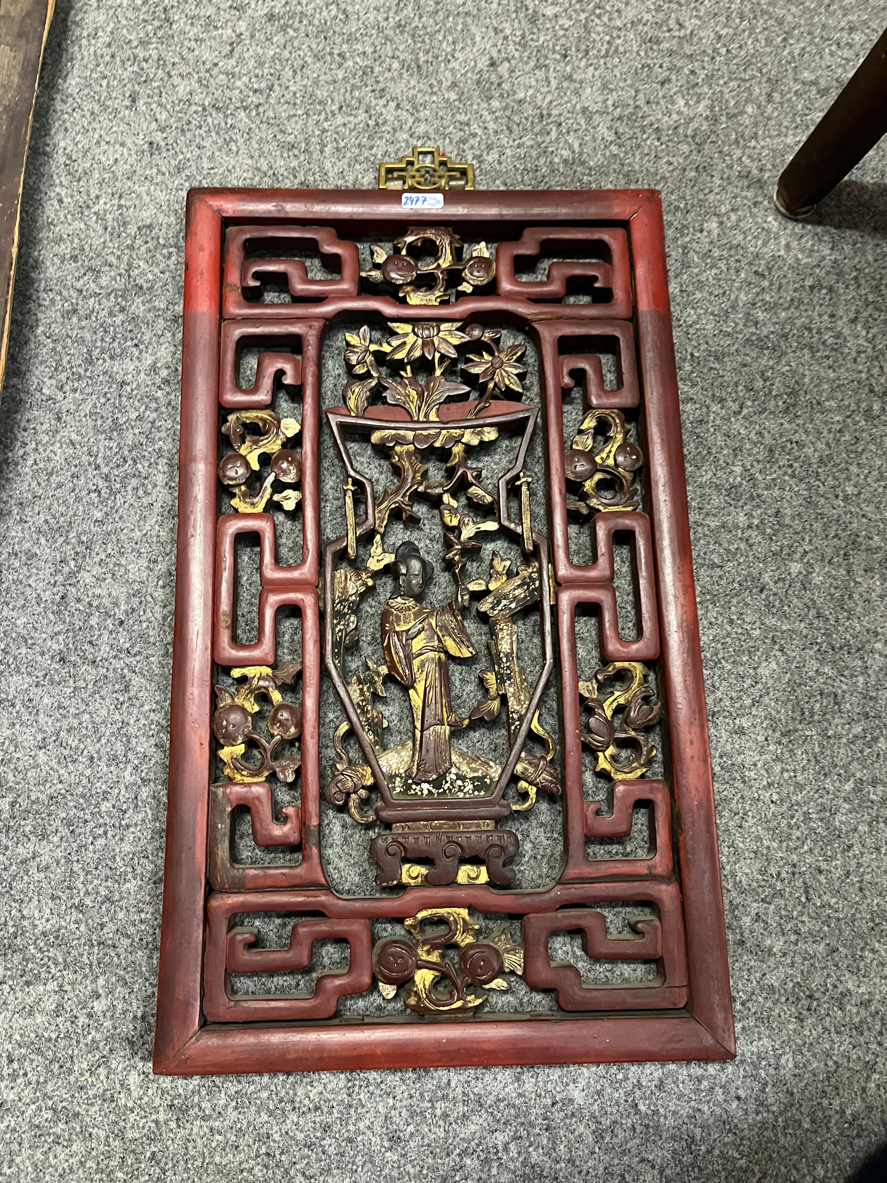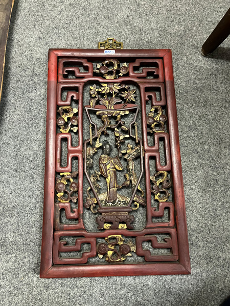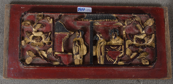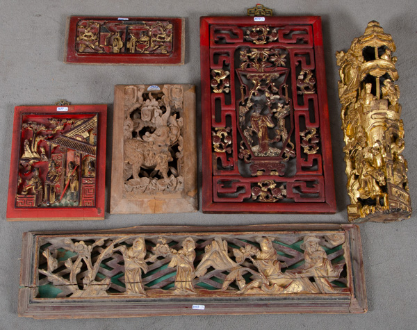 - Katalog-Nr: 2477Sechs Reliefs. Asien. Massivholz, geschnitzt mit Blumen, Figuren und Tieren, teilw. rot lackiert und gold gefasst, 13 x 12 bis 51 x 75 cm. (besch.)o.L.