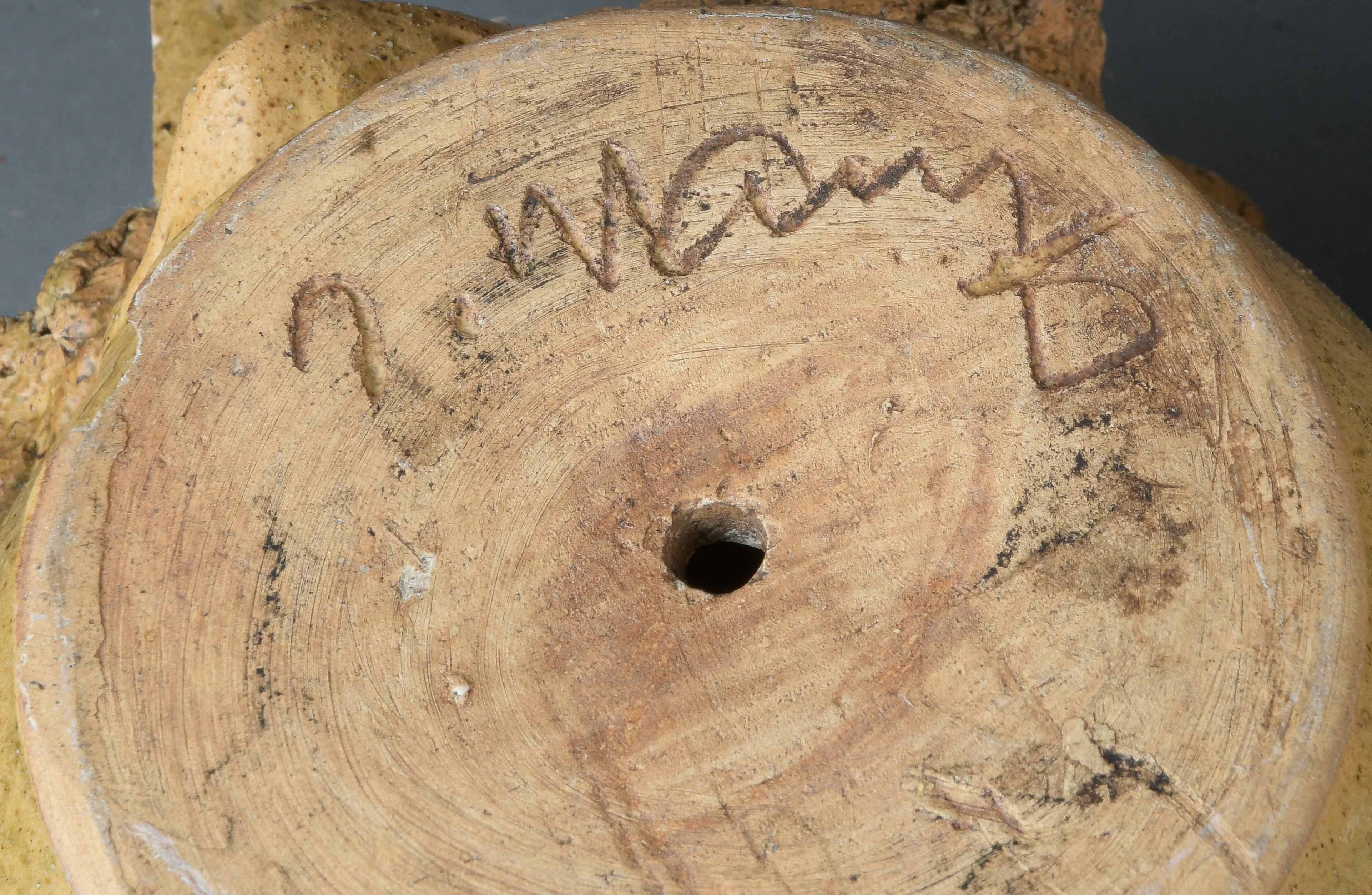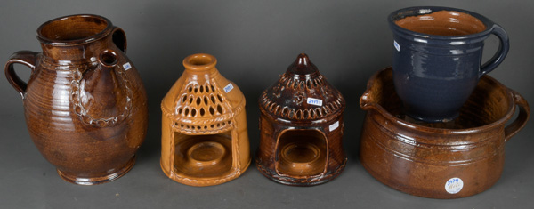 - Katalog-Nr: 2479Jörg von Manz (1939-1997). Fünftlgs. Konvolut Keramikobjekte, teilw. glasiert. Bestehend aus: Ein Henkelkrug (H=26 cm), ein Henkeltopf (H=13 cm, D=25 cm), zwei Handleuchter (H=19,5 / 20 cm) und ein Übertopf (H=17,5 cm).o.L.
