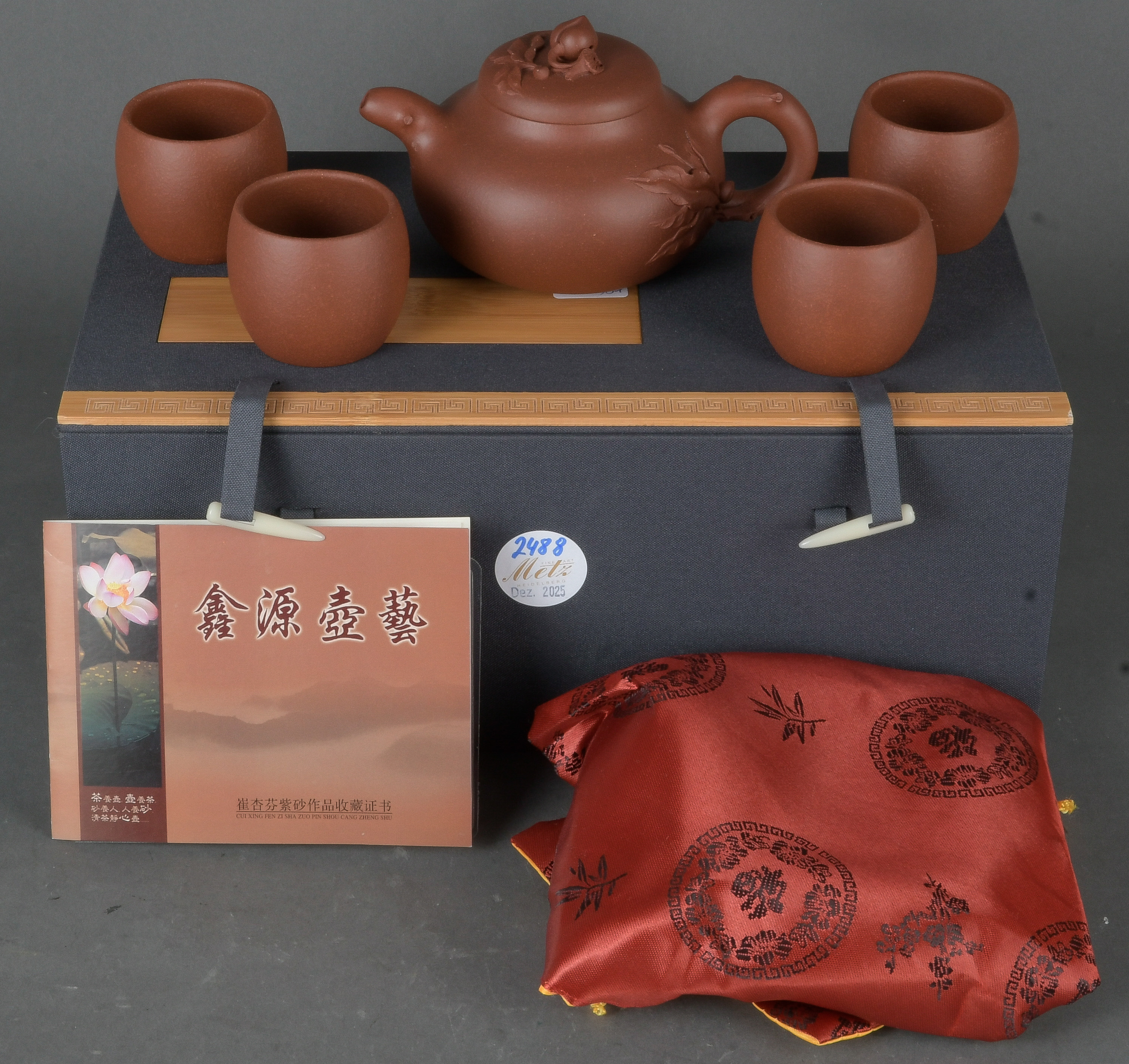 - Katalog-Nr: 2488Fünftlge. Teegarnitur in Box. China. Braunes Steinzeug. Bestehend aus: Eine Kanne (H=9 cm) und vier Koppchen mit Broschüre in Box.o.L.