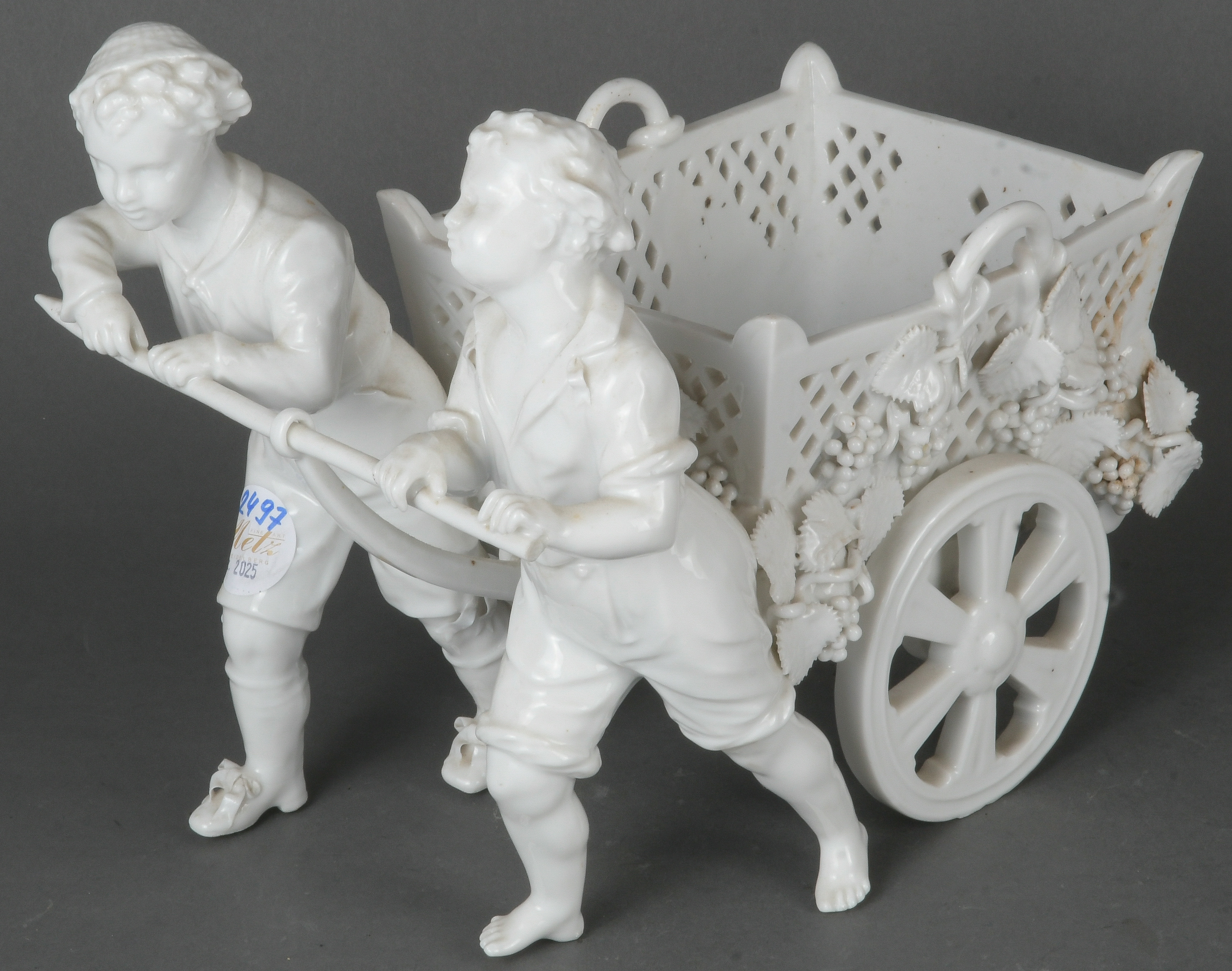 - Katalog-Nr: 2497Kinder mit Leiterwagen. Porzellan, weiß glasiert, am Boden Schwertermarke, H=23,5 cm, B=29 cm, T=20 cm (besch.)o.L.