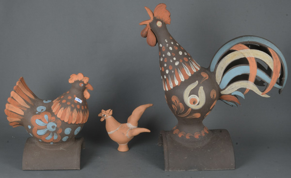 - Katalog-Nr: 2480Jörg von Manz (1939-1997). Hahn, Henne und Küken (Dachreiter). Keramik, teilw. bunt glasiert, H=16 bis 54 cm.o.L.
