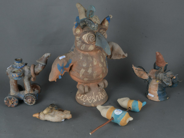 - Katalog-Nr: 2482Jörg von Manz (1939-1997). Fünf Tierfiguren, u.a. Eule und Kamel. Keramik, teilw. bunt glasiert und beschriftet, H=6 bis 43 cm.o.L.