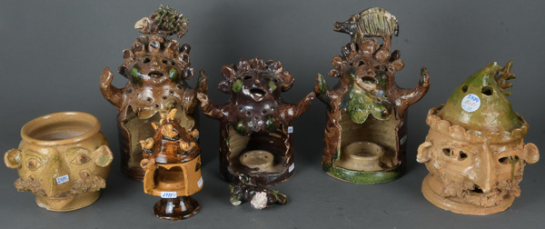 - Katalog-Nr: 2484Jörg von Manz (1939-1997). Sechs verschiedene Kunstobjekte. Fratzenleuchter und Vasen. Keramik, teilw. bunt glasiert, teilw. sign., H=18 bis 31 cm. (teilw. best. / besch.)o.L.