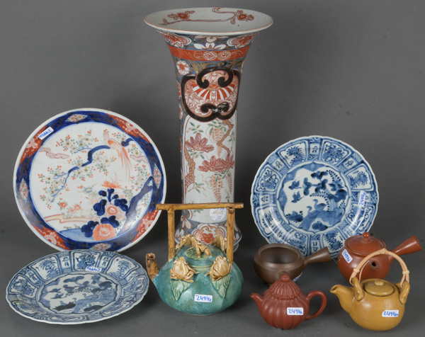 - Katalog-Nr: 2494Achttlgs. Konvolut Asiatika: Drei Teller, vier Kannen und eine Vase. Porzellan, bunt bemalt; H=8 bis 32 cm, D=20 bis 24 cm.o.L.