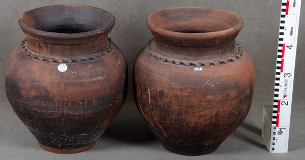 - Katalog-Nr: 2499Paar hohe Gefäße. Italien 20. Jh. Ton, mit Rollstempeldekor, H=je 48 cm. (min. best.)o.L.