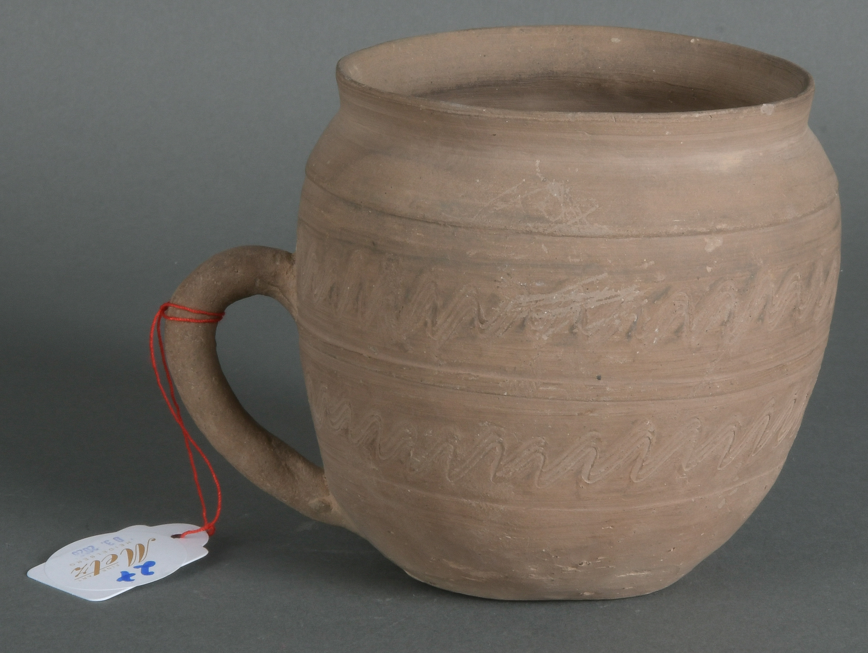 - Katalog-Nr: 27Henkelbecher. Japan / Korea, Kofun-Dynastie ca. 250 - ca. 552 n. Chr. Steinzeug, hellgrauer Scherben, unglasiert, mit anmodelliertem Henkel und Ritzdekor in Form zweier horizontal verlaufender Wellenbänder, H=11 cm. Provenienz: Sammlung Prof. Dr. Peer Hultberg (1935-2007), Hamburg.o.L.