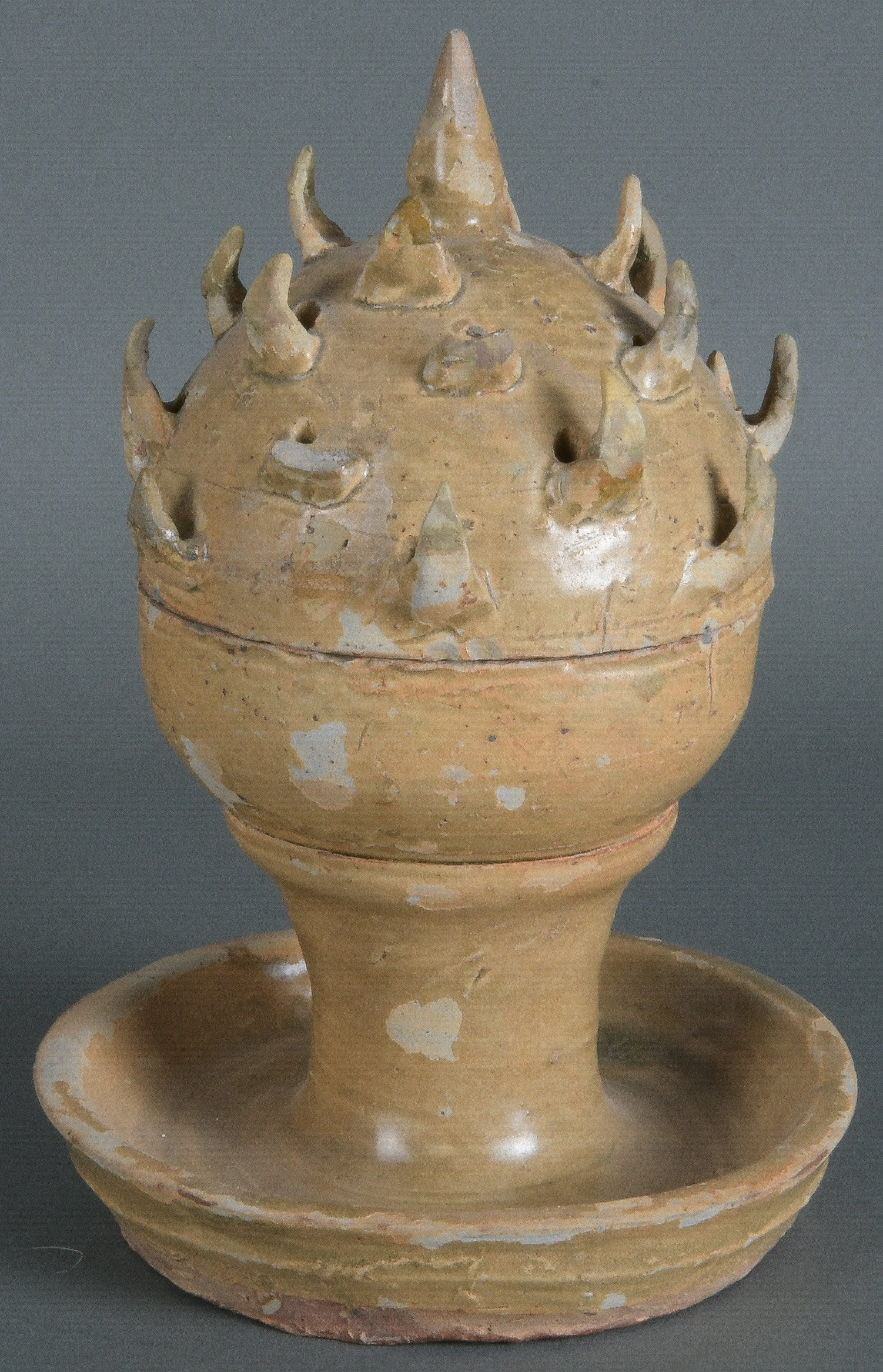 - Katalog-Nr: 29Weihrauchgefäß. China, Han-Dynastie 206 v. Chr. - 220 n. Chr. Steinzeug, mit beigefarbener Glasur. Zweiteilig, das Oberteil mit abstehenden blatt- bzw. stachelförmigen Elementen ähnlich einer Drachenfrucht, H=22 cm, D=15 cm. Provenienz: Sammlung Prof. Dr. Peer Hultberg (1935-2007), Hamburg.o.L.